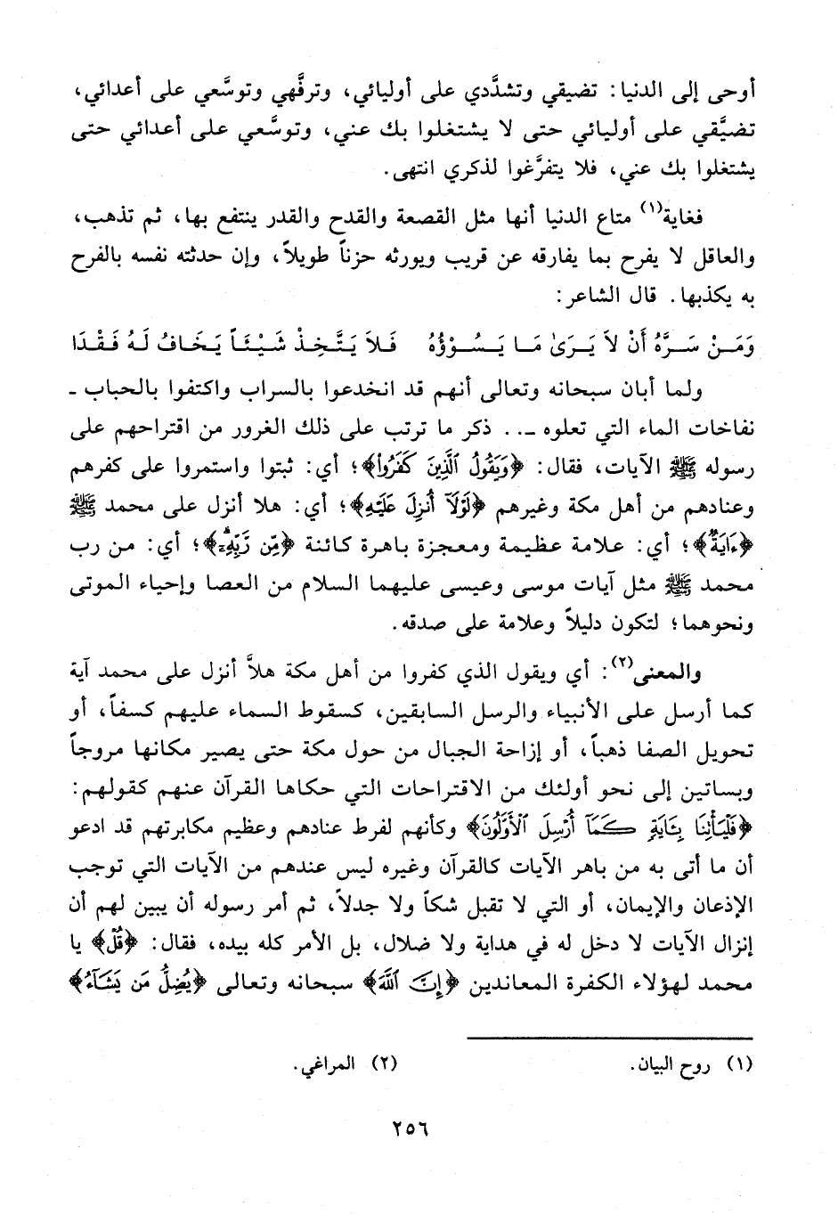 27 - ولما أبان سبحانه وتعالى أنهم قد انخدعوا بالسراب واكتفوا بالحباب - نفاخات الماء التي تعلوه - ... ذكر ما ترتب على ذلك الغرور من اقتراحهم على رسوله - صلى الله عليه وسلم - الآيات، فقال: {وَيَقُولُ الَّذِينَ كَفَرُوا}؛ أي: ثبتوا واستمروا على كفرهم وعنادهم من أهل مكة وغيرهم {لَوْلَا أُنْزِلَ عَلَيْهِ}؛ أي: هلا أنزل على محمَّد - صلى الله عليه وسلم - {آيَةٌ}؛ أي: علامة عظيمة ومعجزة باهرة كائنة {مِنْ رَبِّهِ}؛ أي: من رب محمَّد - صلى الله عليه وسلم - مثل آيات موسى وعيسى عليهما السلام من العصا وإحياء الموتى ونحوهما؛ لتكون دليلًا وعلامة على صدقه.