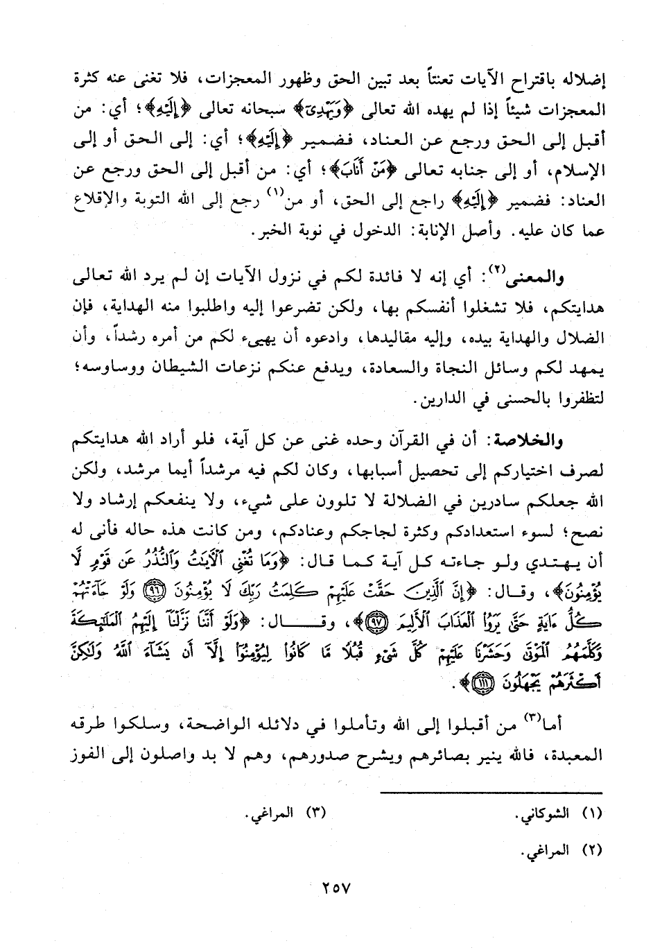 والخلاصة: أن في القرآن وحده غنى عن كل آية، فلو أراد الله هدايتكم لصرف اختياركم إلى تحصيل أسبابها، وكان لكم فيه مرشدًا أيما مرشد، ولكن الله جعلكم سادرين في الضلالة لا تلوون على شيء، ولا ينفعكم إرشاد ولا نصح؛ لسوء استعدادكم وكثرة لجاجكم وعنادكم، ومن كانت هذه حاله فأنى له أن يهتدي ولو جاءته كل آية كما قال: {وَمَا تُغْنِي الْآيَاتُ وَالنُّذُرُ عَنْ قَوْمٍ لَا يُؤْمِنُونَ}، وقال: {إِنَّ الَّذِينَ حَقَّتْ عَلَيْهِمْ كَلِمَتُ رَبِّكَ لَا يُؤْمِنُونَ (96) وَلَوْ جَاءَتْهُمْ كُلُّ آيَةٍ حَتَّى يَرَوُا الْعَذَابَ الْأَلِيمَ (97)} وقال: {وَلَوْ أَنَّنَا نَزَّلْنَا إِلَيْهِمُ الْمَلَائِكَةَ وَكَلَّمَهُمُ الْمَوْتَى وَحَشَرْنَا عَلَيْهِمْ كُلَّ شَيْءٍ قُبُلًا مَا كَانُوا لِيُؤْمِنُوا إِلَّا أَنْ يَشَاءَ اللَّهُ وَلَكِنَّ أَكْثَرَهُمْ يَجْهَلُونَ (111)}.