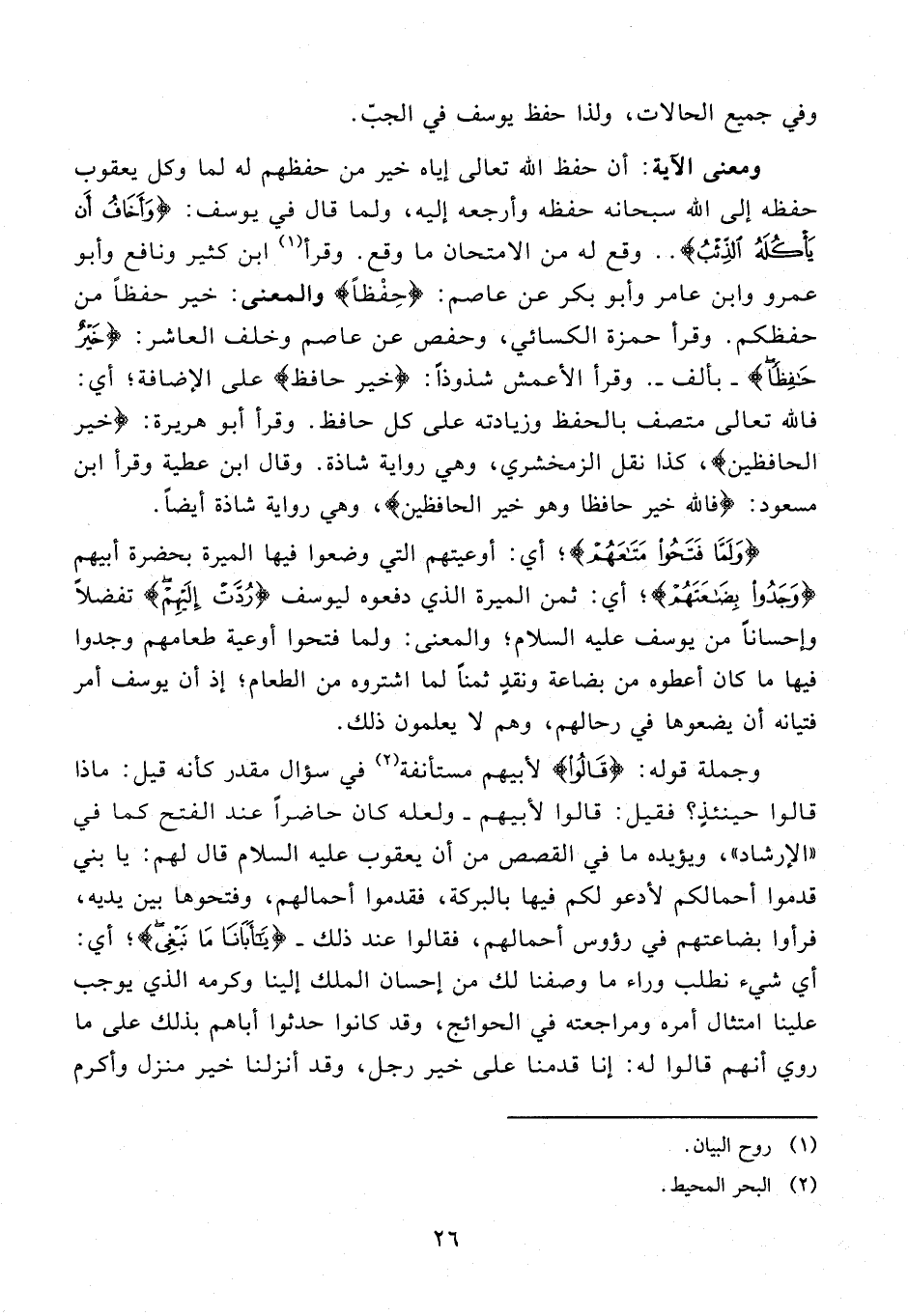 ومعنى الآية: أن حفظ الله تعالى إياه خير من حفظهم له لما وكل يعقوب حفظه إلى الله سبحانه حفظه وأرجعه إليه، ولما قال في يوسف: {وَأَخَافُ أَنْ يَأْكُلَهُ الذِّئْبُ} .. وقع له من الامتحان ما وقع. وقرأ (¬1) ابن كثير ونافع وأبو عمرو وابن عامر وأبو بكر عن عاصم: {حِفْظًا} والمعنى: خير حفظًا من حفظكم. وقرأ حمزة الكسائي، وحفص عن عاصم وخلف العاشر: {خَيْرٌ حَافِظًا} - بألف -. وقرأ الأعمش شذوذًا: {خير حافظ} على الإضافة؛ أي: فالله تعالى متصف بالحفظ وزيادته على كل حافظ. وقرأ أبو هريرة: {خير الحافظين}، كذا نقل الزمخشري، وهي رواية شاذة. وقال ابن عطية وقرأ ابن مسعود: {فالله خير حافظًا وهو خير الحافظين}، وهي رواية شاذة أيضًا.