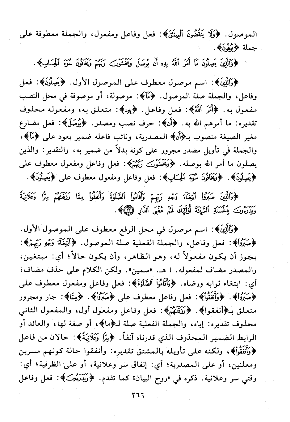 {وَالَّذِينَ}: اسم موصول معطوف على الموصول الأول. {يَصِلُونَ}: فعل وفاعل، والجملة صلة الموصول. {مَا}: موصولة، أو موصوفة في محل النصب مفعول به. {أَمَرَ اللَّهُ}: فعل وفاعل. {بِهِ}: متعلق به، ومفعوله محذوف تقديره: ما أمرهم الله به. {أَنْ}: حرف نصب ومصدر. {يُوصَلَ}: فعل مضارع مغير الصيغة منصوب بـ {أَنْ} المصدرية، ونائب فاعله ضمير يعود على {مَا}، والجملة في تأويل مصدر مجرور على كونه بدلًا من ضمير به، والتقدير: والذين يصلون ما أمر الله بوصله. {وَيَخْشَوْنَ رَبَّهُمْ}: فعل وفاعل ومفعول معطوف على {يَصِلُونَ}. {وَيَخَافُونَ سُوءَ الْحِسَابِ}: فعل وفاعل ومفعول معطوف على {يَصِلُونَ}.