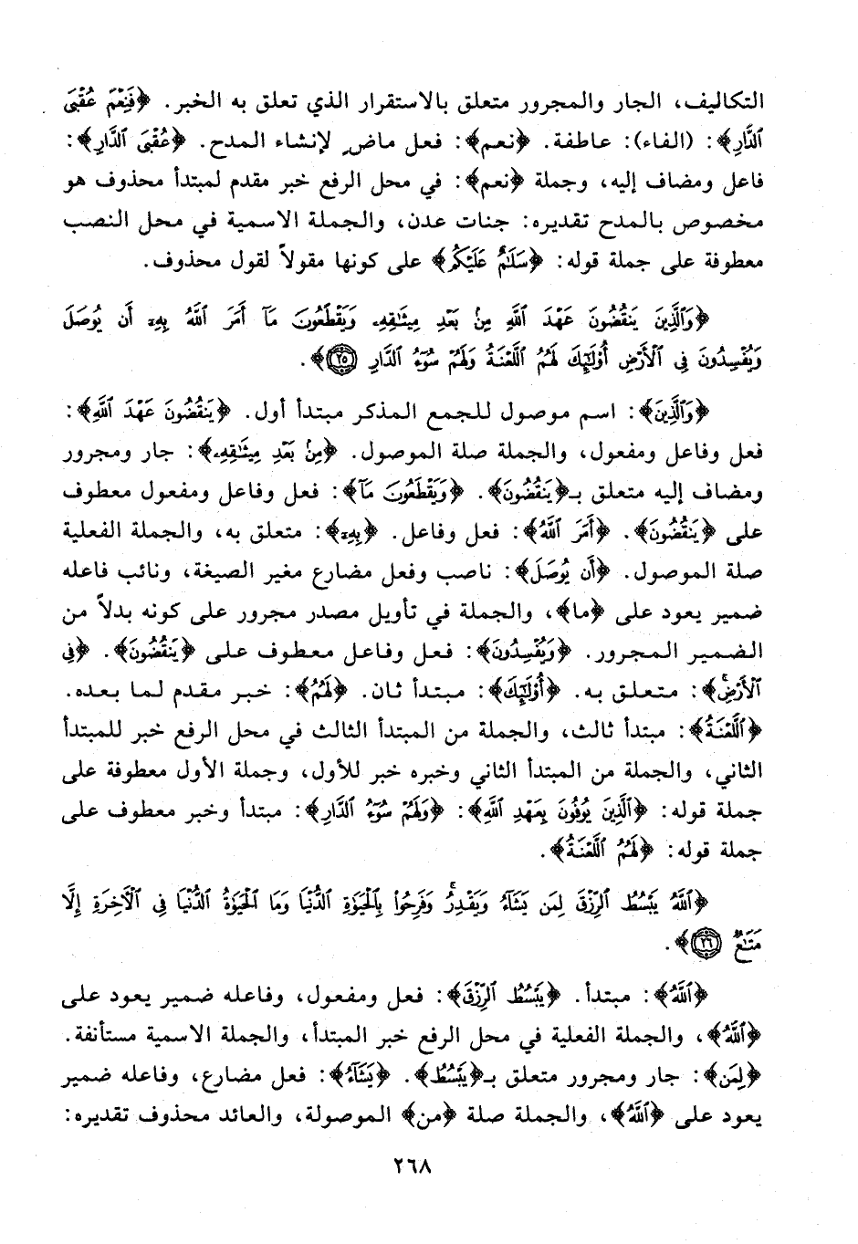 {وَالَّذِينَ}: اسم موصول للجمع المذكر مبتدأ أول. {يَنْقُضُونَ عَهْدَ اللهِ}: فعل وفاعل ومفعول، والجملة صلة الموصول. {مِنْ بَعْدِ مِيثَاقِهِ}: جار ومجرور ومضاف إليه متعلق بـ {يَنْقُضُونَ}. {وَيَقْطَعُونَ مَا}: فعل وفاعل ومفعول معطوف على {يَنْقُضُونَ}. {أَمَرَ الله}: فعل وفاعل. {بِهِ}: متعلق به، والجملة الفعلية صلة الموصول. {أَنْ يُوصَلَ}: ناصب وفعل مضارع مغير الصيغة، ونائب فاعله ضمير يعود على {ما}، والجملة في تأويل مصدر مجرور على كونه بدلًا من الضمير المجرور. {وَيُفْسِدُونَ}: فعل وفاعل معطوف على {يَنْقُضُونَ}. {في الْأَرْضِ}: متعلق به. {أُولَئِكَ}: مبتدأ ثان. {لَهُمْ}: خبر مقدم لما بعده. {اللَّعْنَةُ}: مبتدأ ثالث، والجملة من المبتدأ الثالث في محل الرفع خبر للمبتدأ الثاني، والجملة من المبتدأ الثاني وخبره خبر للأول، وجملة الأول معطوفة على جملة قوله: {الَّذِينَ يُوفُونَ بِعَهْدِ اللهِ}: {وَلَهُمْ سُوءُ الدَّارِ}: مبتدأ وخبر معطوف على جملة قوله: {لَهُمُ اللَّعْنَةُ}.