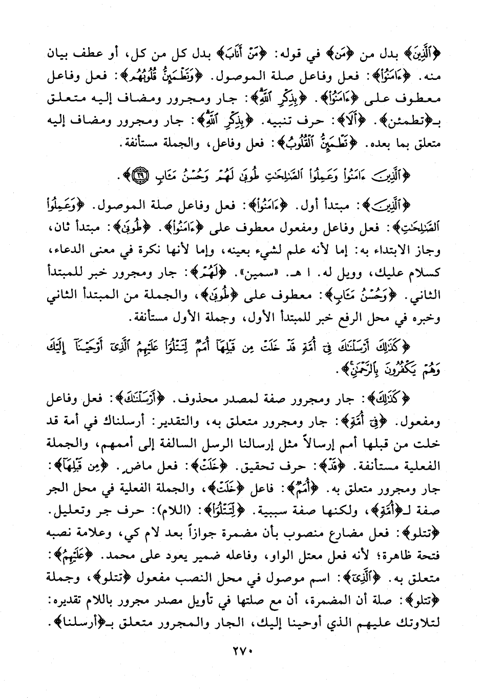 {الَّذِينَ} بدل من {مَنْ} في قوله: {مَنْ أَنَابَ} بدل كل من كل، أو عطف بيان منه. {آمَنُوا}: فعل وفاعل صلة الموصول. {وَتَطْمَئِنُّ قُلُوبُهُمْ}: فعل وفاعل معطوف على {آمَنُوا}. {بِذِكْرِ اللهِ}: جار ومجرور ومضاف إليه متعلق بـ {تَطْمَئِنُّ}. {أَلَا}: حرف تنبيه. {بِذِكْرِ اللهِ}: جار ومجرور ومضاف إليه متعلق بما بعده. {تَطْمَئِنُّ الْقُلُوبُ}: فعل وفاعل، والجملة مستأنفة.