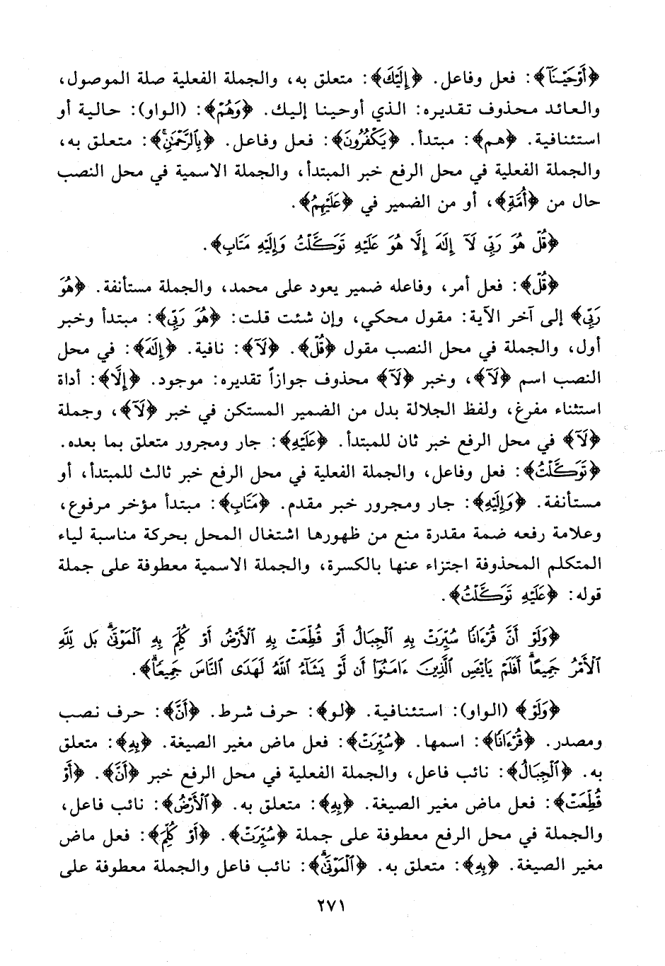 {وَلَوْ} (الواو): استئنافية. {لَوْ}: حرف شرط. {أَنَّ}: حرف نصب ومصدر. {قُرْآنًا}: اسمها. {سُيِّرَتْ}: فعل ماض مغير الصيغة. {بِهِ}: متعلق به. {الْجِبَالُ}: نائب فاعل، والجملة الفعلية في محل الرفع خبر {أَنَّ}. {أَوْ قُطِّعَتْ}: فعل ماض مغير الصيغة. {بِهِ}: متعلق به. {الْأَرْضُ}: نائب فاعل، والجملة في محل الرفع معطوفة على جملة {سُيِّرَتْ}. {أَوْ كُلِّمَ}: فعل ماض مغير الصيغة. {بِهِ}: متعلق به. {الْمَوْتَى}: نائب فاعل والجملة معطوفة على
