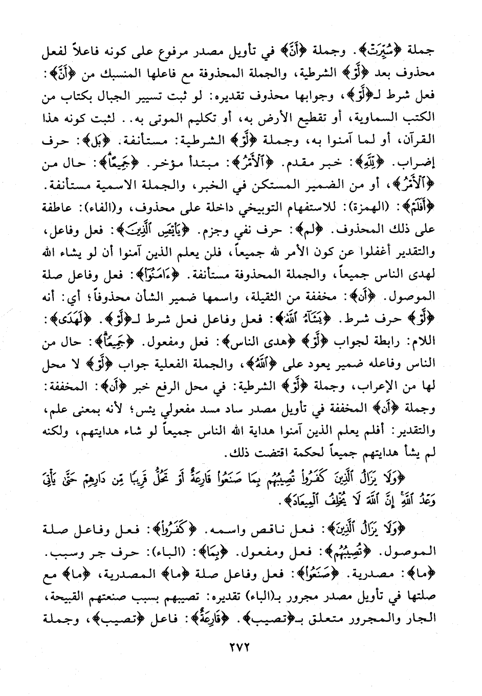 جملة {سُيِّرَتْ}. وجملة {أَنَّ} في تأويل مصدر مرفوع على كونه فاعلًا لفعل محذوف بعد {لَوْ} الشرطية، والجملة المحذوفة مع فاعلها المنسبك من {أَنَّ}: فعل شرط لـ {لَوْ}، وجوابها محذوف تقديره: لو ثبت تسيير الجبال بكتاب من الكتب السماوية، أو تقطيع الأرض به، أو تكليم الموتى به .. لثبت كونه هذا القرآن، أو لما آمنوا به، وجملة {لَوْ} الشرطية: مستأنفة. {بَل}: حرف إضراب. {لِلَّهِ}: خبر مقدم. {الْأَمْرُ}: مبتدأ مؤخر. {جَمِيعًا}: حال من {الْأَمْرُ}، أو من الضمير المستكن في الخبر، والجملة الاسمية مستأنفة. {أَفَلَمْ}: (الهمزة): للاستفهام التوبيخي داخلة على محذوف، و (الفاء): عاطفة على ذلك المحذوف. {لَمْ}: حرف نفي وجزم. {يَيْأَسِ الَّذِينَ}: فعل وفاعل، والتقدير أغفلوا عن كون الأمر لله جميعًا، فلن يعلم الذين آمنوا أن لو يشاء الله لهدى الناس جميعًا، والجملة المحذوفة مستأنفة. {آمَنُوا}: فعل وفاعل صلة الموصول. {أَنَّ}: مخففة من الثقيلة، واسمها ضمير الشأن محذوفًا؛ أي: أنه {لَوْ} حرف شرط. {يَشَاءُ الله}: فعل وفاعل فعل شرط لـ {لَوْ}. {لَهَدَى}: اللام: رابطة لجواب {لَوْ} {هَدَى النَّاسَ}: فعل ومفعول. {جَمِيعًا}: حال من الناس وفاعله ضمير يعود على {الله}، والجملة الفعلية جواب {لَوْ} لا محل لها من الإعراب، وجملة {لَوْ} الشرطية: في محل الرفع خبر {أَنْ}: المخففة: وجملة {أَنْ} المخففة في تأويل مصدر ساد مسد مفعولي يئس؛ لأنه بمعنى علم، والتقدير: أفلم يعلم الذين آمنوا هداية الله الناس جميعًا لو شاء هدايتهم، ولكنه لم يشأ هدايتهم جميعًا لحكمة اقتضت ذلك.