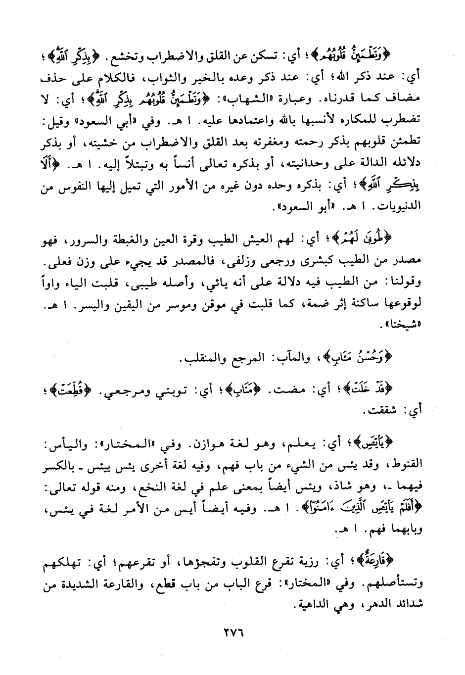 {وَتَطْمَئِنُّ قُلُوبُهُمْ}؛ أي: تسكن عن القلق والاضطراب وتخشع. {بِذِكْرِ اللهِ}؛ أي: عند ذكر الله؛ أي: عند ذكر وعده بالخير والثواب، فالكلام على حذف مضاف كما قدرناه. وعبارة "الشهاب": {وَتَطْمَئِنُّ قُلُوبُهُمْ بِذِكْرِ اللهِ}؛ أي: لا تضطرب للمكاره لأنسبها بالله واعتمادها عليه. اهـ. وفي "أبي السعود" وقيل: تطمئن قلوبهم بذكر رحمته ومغفرته بعد القلق والاضطراب من خشيته، أو بذكر دلائله الدالة على وحدانيته، أو بذكره تعالى أنسًا به وتبتلًا إليه. اهـ {أَلَا بِذِكْرِ اللهِ}؛ أي: بذكره وحده دون غيره من الأمور التي تميل إليها النفوس من الدنيويات. اهـ. "أبو السعود".