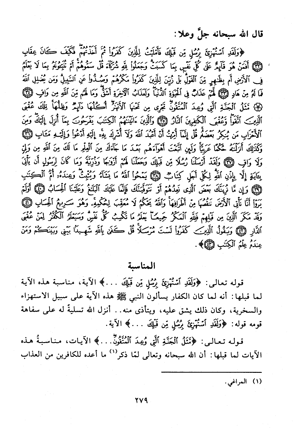 {وَلَقَدِ اسْتُهْزِئَ بِرُسُلٍ مِنْ قَبْلِكَ فَأَمْلَيْتُ لِلَّذِينَ كَفَرُوا ثُمَّ أَخَذْتُهُمْ فَكَيْفَ كَانَ عِقَابِ (32) أَفَمَنْ هُوَ قَائِمٌ عَلَى كُلِّ نَفْسٍ بِمَا كَسَبَتْ وَجَعَلُوا لِلَّهِ شُرَكَاءَ قُلْ سَمُّوهُمْ أَمْ تُنَبِّئُونَهُ بِمَا لَا يَعْلَمُ فِي الْأَرْضِ أَمْ بِظَاهِرٍ مِنَ الْقَوْلِ بَلْ زُيِّنَ لِلَّذِينَ كَفَرُوا مَكْرُهُمْ وَصُدُّوا عَنِ السَّبِيلِ وَمَنْ يُضْلِلِ اللَّهُ فَمَا لَهُ مِنْ هَادٍ (33) لَهُمْ عَذَابٌ فِي الْحَيَاةِ الدُّنْيَا وَلَعَذَابُ الْآخِرَةِ أَشَقُّ وَمَا لَهُمْ مِنَ اللَّهِ مِنْ وَاقٍ (34) مَثَلُ الْجَنَّةِ الَّتِي وُعِدَ الْمُتَّقُونَ تَجْرِي مِنْ تَحْتِهَا الْأَنْهَارُ أُكُلُهَا دَائِمٌ وَظِلُّهَا تِلْكَ عُقْبَى الَّذِينَ اتَّقَوْا وَعُقْبَى الْكَافِرِينَ النَّارُ (35) وَالَّذِينَ آتَيْنَاهُمُ الْكِتَابَ يَفْرَحُونَ بِمَا أُنْزِلَ إِلَيْكَ وَمِنَ الْأَحْزَابِ مَنْ يُنْكِرُ بَعْضَهُ قُلْ إِنَّمَا أُمِرْتُ أَنْ أَعْبُدَ اللَّهَ وَلَا أُشْرِكَ بِهِ إِلَيْهِ أَدْعُو وَإِلَيْهِ مَآبِ (36) وَكَذَلِكَ أَنْزَلْنَاهُ حُكْمًا عَرَبِيًّا وَلَئِنِ اتَّبَعْتَ أَهْوَاءَهُمْ بَعْدَ مَا جَاءَكَ مِنَ الْعِلْمِ مَا لَكَ مِنَ اللَّهِ مِنْ وَلِيٍّ وَلَا وَاقٍ (37) وَلَقَدْ أَرْسَلْنَا رُسُلًا مِنْ قَبْلِكَ وَجَعَلْنَا لَهُمْ أَزْوَاجًا وَذُرِّيَّةً وَمَا كَانَ لِرَسُولٍ أَنْ يَأْتِيَ بِآيَةٍ إِلَّا بِإِذْنِ اللَّهِ لِكُلِّ أَجَلٍ كِتَابٌ (38) يَمْحُو اللَّهُ مَا يَشَاءُ وَيُثْبِتُ وَعِنْدَهُ أُمُّ الْكِتَابِ (39) وَإِنْ مَا نُرِيَنَّكَ بَعْضَ الَّذِي نَعِدُهُمْ أَوْ نَتَوَفَّيَنَّكَ فَإِنَّمَا عَلَيْكَ الْبَلَاغُ وَعَلَيْنَا الْحِسَابُ (40) أَوَلَمْ يَرَوْا أَنَّا نَأْتِي الْأَرْضَ نَنْقُصُهَا مِنْ أَطْرَافِهَا وَاللَّهُ يَحْكُمُ لَا مُعَقِّبَ لِحُكْمِهِ وَهُوَ سَرِيعُ الْحِسَابِ (41) وَقَدْ مَكَرَ الَّذِينَ مِنْ قَبْلِهِمْ فَلِلَّهِ الْمَكْرُ جَمِيعًا يَعْلَمُ مَا تَكْسِبُ كُلُّ نَفْسٍ وَسَيَعْلَمُ الْكُفَّارُ لِمَنْ عُقْبَى الدَّارِ (42) وَيَقُولُ الَّذِينَ كَفَرُوا لَسْتَ مُرْسَلًا قُلْ كَفَى بِاللَّهِ شَهِيدًا بَيْنِي وَبَيْنَكُمْ وَمَنْ عِنْدَهُ عِلْمُ الْكِتَابِ (43)}.