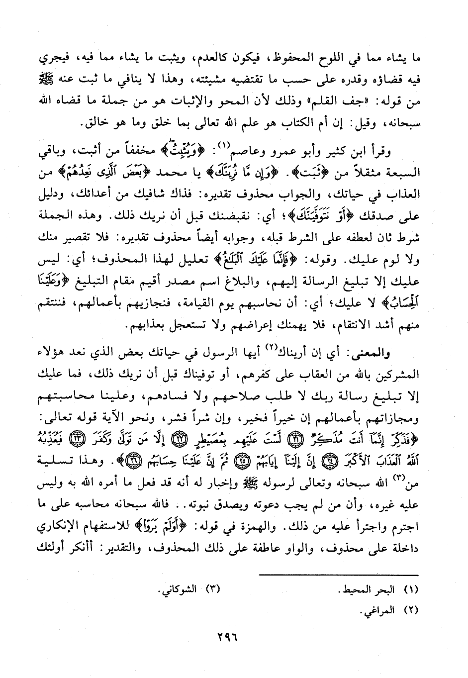 40 - {وَإِنْ مَا نُرِيَنَّكَ} يا محمد {بَعْضَ الَّذِي نَعِدُهُمْ} من العذاب في حياتك، والجواب محذوف تقديره: فذاك شافيك من أعدائك، ودليل على صدقك {أَوْ نَتَوَفَّيَنَّكَ}؛ أي: نقبضنك قبل أن نريك ذلك. وهذه الجملة شرط ثان لعطفه على الشرط قبله، وجوابه أيضًا محذوف تقديره: فلا تقصير منك ولا لوم عليك. وقوله: {فَإِنَّمَا عَلَيْكَ الْبَلَاغُ} تعليل لهذا المحذوف؛ أي: ليس عليك إلا تبليغ الرسالة إليهم، والبلاغ اسم مصدر أقيم مقام التبليغ {وَعَلَيْنَا الْحِسَابُ} لا عليك؛ أي: أن نحاسبهم يوم القيامة، فنجازيهم بأعمالهم، فننتقم منهم أشد الانتقام، فلا يهمنك إعراضهم ولا تستعجل بعذابهم.