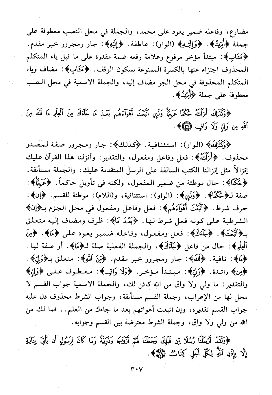 {وَكَذَلِكَ} (الواو): استئنافية. {كَذَلِكَ}: جار ومجرور صفة لمصدر محذوف. {أَنْزَلْنَاهُ}: فعل وفاعل ومفعول، والتقدير: وأنزلنا هذا القرآن عليك إنزالًا مثل إنزالنا الكتب السالفة على الرسل المتقدمة عليك، والجملة مستأنفة. {حُكْمًا}: حال موطئة من ضمير المفعول، ولكنه في تأويل حاكمًا. {عَرَبِيًّا}: صفة لـ {حُكْمًا}. {وَلَئِنِ}: (الواو): اسئنافية، و (اللام): موطئة للقسم. {إن}: حرف شرط. {اتَّبَعْتَ أَهْوَاءَهُمْ}: فعل وفاعل ومفعول في محل الجزم بـ {إن} الشرطية على كونه فعل شرط لها. {بَعْدَمَا}: ظرف ومضاف إليه متعلق بـ {اتَّبَعْتَ}. {جَاءَكَ}: فعل ومفعول، وفاعله ضمير يعود على {مَا}. {مِنَ الْعِلْمِ}: حال من فاعل {جَاءَكَ}، والجملة الفعلية صلة لـ {مَا}، أو صفة لها. {مَا}: نافية. {لَكَ}: جار ومجرور خبر مقدم. {مِنَ اللَّهِ}: متعلق بـ {وَلِيٍّ}. {مِنْ} زائدة. {وَلِيٍّ}: مبتدأ مؤخر. {وَلَا وَاقٍ}: معطوف على {وَلِيٍّ} والتقدير: ما ولي ولا واق من الله كائن لك، والجملة الاسمية جواب القسم لا محل لها من الإعراب، وجملة القسم مستأنفة، وجواب الشرط محذوف دل عليه جواب القسم تقديره، وإن اتبعت أهوائهم بعد ما جاءك من العلم .. فما لك من الله من ولي ولا واق، وجملة الشرط معترضة بين القسم وجوابه.