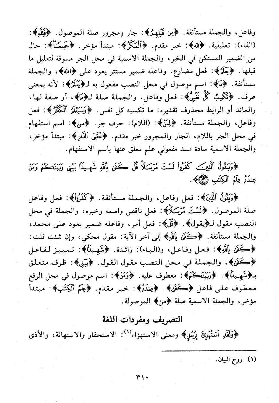 {وَيَقُولُ الَّذِينَ}: فعل وفاعل، والجملة مستأنفة. {كَفَرُوا}: فعل وفاعل صلة الموصول. {لَسْتَ مُرْسَلًا}: فعل ناقص واسمه وخبره، والجملة في محل النصب مقول لـ {يَقُولُ}. {قُلْ}: فعل أمر، وفاعله ضمير يعود على محمد، والجملة مستأنفة. {كفى بالله} إلى آخر الآية: مقول محكي، وإن شئت قلت: {كَفَى بِاللَّهِ}: فعل وفاعل، و (الباء): زائدة. {شَهِيدًا}: تمييز لفاعل {كَفَى}، والجملة في محل النصب مقول القول. {بَيْنِي}: ظرف متعلق بـ {شَهِيدًا}. {وَبَيْنَكُمْ}: معطوف عليه. {وَمَنْ}: اسم موصول في محل الرفع معطوف على فاعل {كَفَى}. {عِنْدَهُ}: خبر مقدم. {عِلْمُ الْكِتَابِ}: مبتدأ مؤخر، والجملة الاسمية صلة {مَنْ} الموصولة.
