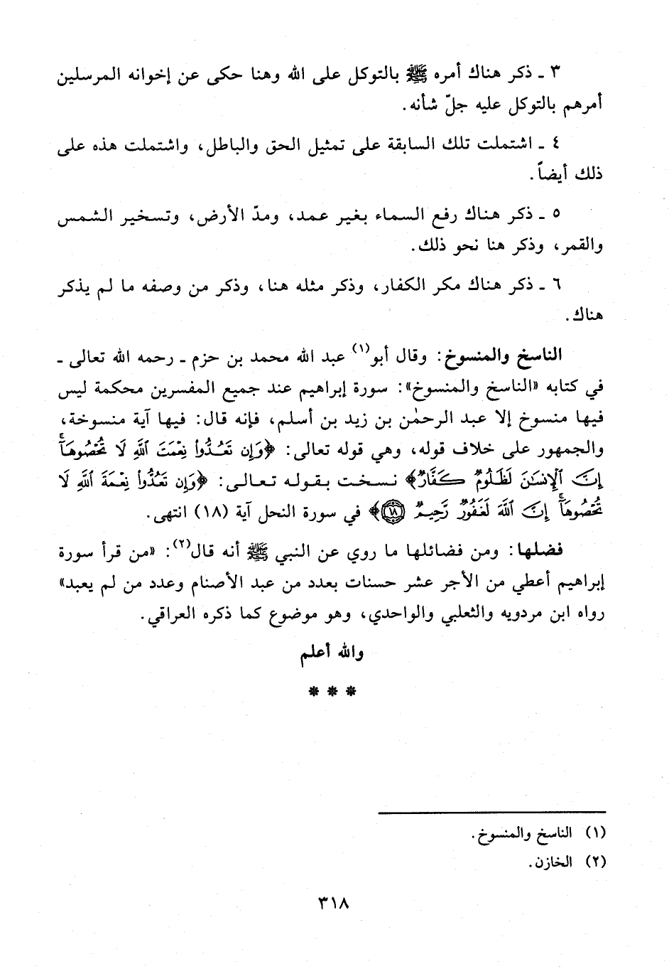 الناسخ والمنسوخ: وقال أبو (¬1) عبد الله محمد بن حزم - رحمه الله تعالى - في كتابه "الناسخ والمنسوخ": سورة إبراهيم عند جميع المفسرين محكمة ليس فيها منسوخ إلا عبد الرحمن بن زيد بن أسلم، فإنه قال: فيها آية منسوخة، والجمهور على خلاف قوله، وهي قوله تعالى: وَإِنْ تَعُدُّوا نِعْمَةَ اللَّهِ لَا تُحْصُوهَا إِنَّ الْإِنْسَانَ لَظَلُومٌ كَفَّارٌ} نسخت بقوله تعالى: {وَإِنْ تَعُدُّوا نِعْمَتَ اللَّهِ لَا تُحْصُوهَا إِنَّ اللَّهَ لَغَفُورٌ رَحِيمٌ} في سورة النحل آية (18) انتهى.
