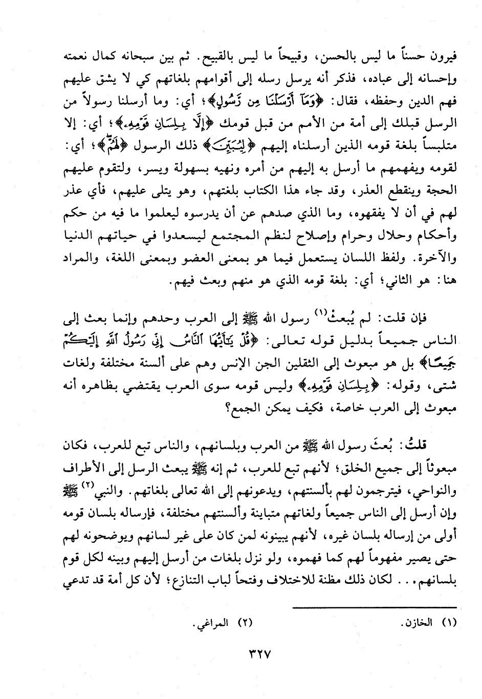 قلتُ: بُعثَ رسول الله - صلى الله عليه وسلم - من العرب وبلسانهم، والناس تبع للعرب، فكان مبعوثًا إلى جميع الخلق؛ لأنهم تبع للعرب، ثم إنه - صلى الله عليه وسلم - يبعث الرسل إلى الأطراف والنواحي، فيترجمون لهم بألسنتهم، ويدعونهم إلى الله تعالى بلغاتهم. والنبي (¬2) - صلى الله عليه وسلم - وإن أرسل إلى الناس جميعًا ولغاتهم متباينة وألسنتهم مختلفة، فإرساله بلسان قومه أولى من إرساله بلسان غيره، لأنهم يبينونه لمن كان على غير لسانهم ويوضحونه لهم حتى يصير مفهومًا لهم كما فهموه، ولو نزل بلغات من أرسل إليهم وبينه لكل قوم بلسانهم ... لكان ذلك مظنة للاختلاف وفتحًا لباب التنازع؛ لأن كل أمة قد تدعي