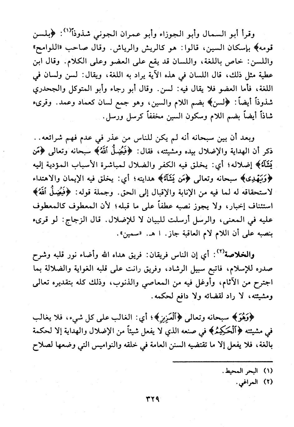 وبعد أن بين سبحانه أنه لم يكن للناس من عذر في عدم فهم شرائعه .. ذكر أن الهداية والإضلال بيده ومشيئته، فقال: {فَيُضِلُّ اللَّهُ} سبحانه وتعالى {مَنْ يَشَاءُ} إضلاله؛ أي: يخلق فيه الكفر والضلال لمباشرة الأسباب المؤدية إليه {وَيَهْدِي} سبحانه وتعالى {مَنْ يَشَاءُ} هدايته؛ أي: يخلق فيه الإيمان والاهتداء لاستحقاقه له لما فيه من الإنابة والإقبال إلى الحق. وجملة قوله: {فَيُضِلُّ اللَّهُ} استئناف إخبار، ولا يجوز نصبه عطفًا على ما قبله؛ لأن المعطوف كالمعطوف عليه في المعنى، والرسل أرسلت للبيان لا للإضلال. قال الزجاج: لو قرئ بنصبه على أن اللام لام العاقبة جاز. اهـ. "سمين".