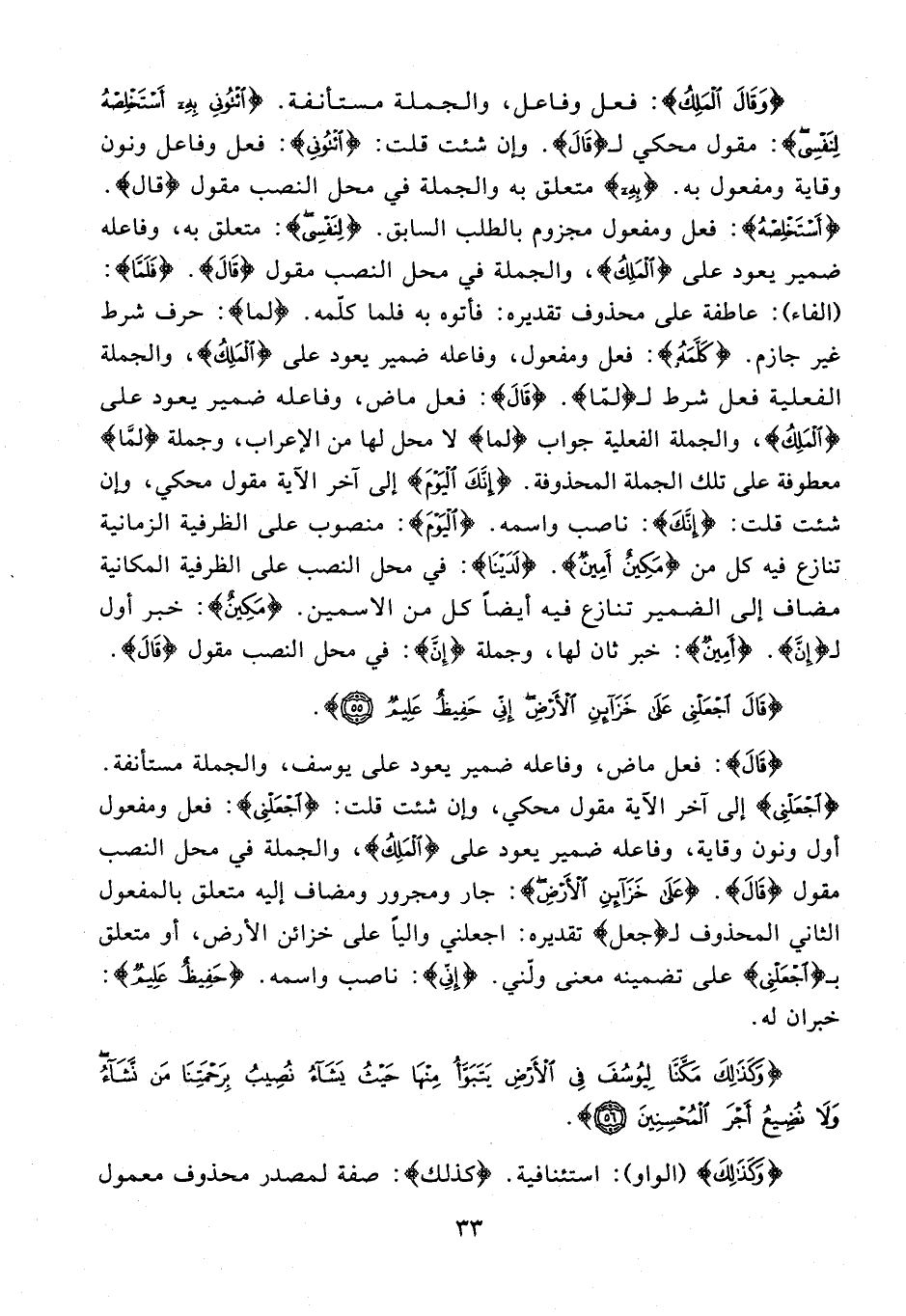 {وَقَالَ الْمَلِكُ}: فعل وفاعل، والجملة مستأنفة. {ائْتُونِي بِهِ أَسْتَخْلِصْهُ لِنَفْسِي}: مقول محكي لـ {قَالَ}. وإن شئت قلت: {ائْتُونِي}: فعل وفاعل ونون وقاية ومفعول به. {بِهِ} متعلق به والجملة في محل النصب مقول {قال}. {أَسْتَخْلِصْهُ}: فعل ومفعول مجزوم بالطلب السابق. {لِنَفْسِي}: متعلق به، وفاعله ضمير يعود على {الْمَلِكُ}، والجملة في محل النصب مقول {قَالَ}. {فَلَمَّا}: (الفاء): عاطفة على محذوف تقديره: فأتوه به فلما كلّمه. {لما}: حرف شرط غير جازم. {كَلَّمَهُ}: فعل ومفعول، وفاعله ضمير يعود على {الْمَلِكُ}، والجملة الفعلية فعل شرط لـ {لمّا}. {قَالَ}: فعل ماض، وفاعله ضمير يعود على {الْمَلِكُ}، والجملة الفعلية جواب {لما} لا محل لها من الإعراب، وجملة {لمَّا} معطوفة على تلك الجملة المحذوفة. {إِنَّكَ الْيَوْمَ} إلى آخر الآية مقول محكي، وإن شئت قلت: {إِنَّكَ}: ناصب واسمه. {الْيَوْمَ}: منصوب على الظرفية الزمانية تنازع فيه كل من {مَكِينٌ أَمِينٌ}. {لَدَيْنَا}: في محل النصب على الظرفية المكانية مضاف إلى الضمير تنازع فيه أيضًا كل من الاسمين. {مَكِينٌ}: خبر أول لـ {إِنَّ}. {أَمِينٌ}: خبر ثان لها، وجملة {إِنَّ}: في محل النصب مقول {قَالَ}.