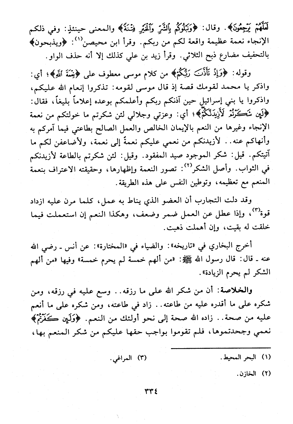 لَعَلَّهُمْ يَرْجِعُونَ}. وقال: {وَنَبْلُوكُمْ بِالشَّرِّ وَالْخَيْرِ فِتْنَةً} والمعنى حينئذٍ: وفي ذلكم الإنجاء نعمة عظيمة واقعة لكم من ربكم. وقرأ ابن محيصن (¬1): {وَيَذْبَحُونَ} بالتخفيف مضارع ذبح الثلاثي. وقرأ زيد بن علي كذلك إلا أنه حذف الواو.