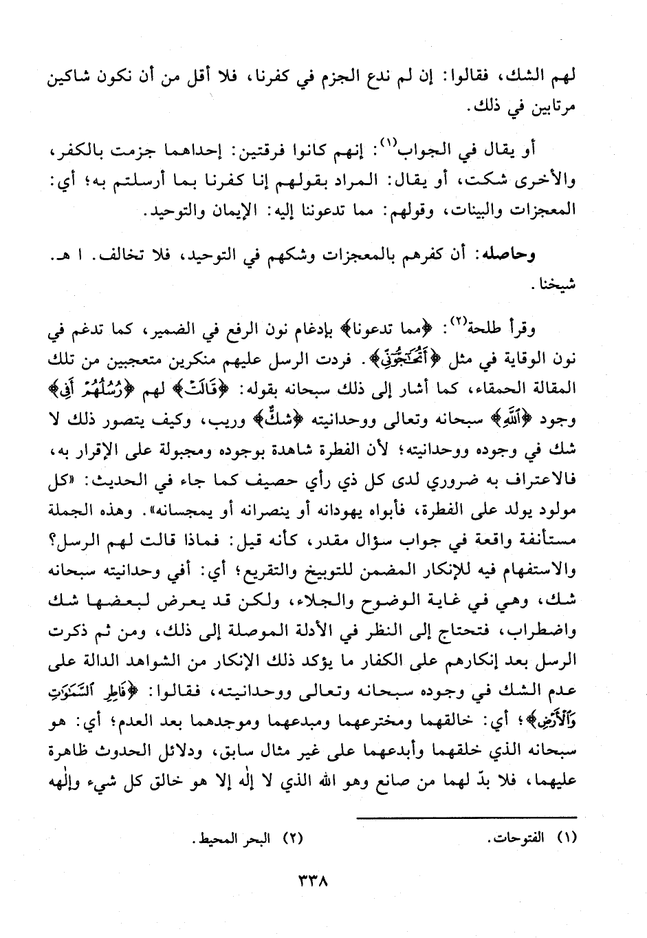 10 - فردت الرسل عليهم منكرين متعجبين من تلك المقالة الحمقاء، كما أشار إلى ذلك سبحانه بقوله: {قَالَتْ} لهم {رُسُلُهُمْ أَفِي} وجود {اللهِ} سبحانه وتعالى ووحدانيته {شَكٌّ} وريب، وكيف يتصور ذلك لا شك في وجوده ووحدانيته؛ لأن الفطرة شاهدة بوجوده ومجبولة على الإقرار به، فالاعتراف به ضروري لدى كل ذي رأي حصيف كما جاء في الحديث: "كل مولود يولد على الفطرة، فأبواه يهودانه أو ينصرانه أو يمجسانه". وهذه الجملة مستأنفة واقعة في جواب سؤال مقدر، كأنه قيل: فماذا قالت لهم الرسل؟ والاستفهام فيه للإنكار المضمن للتوبيخ والتقريع؛ أي: أفي وحدانيته سبحانه شك، وهي في غاية الوضوح والجلاء، ولكن قد يعرض لبعضها شك واضطراب، فتحتاج إلى النظر في الأدلة الموصلة إلى ذلك، ومن ثم ذكرت الرسل بعد إنكارهم على الكفار ما يؤكد ذلك الإنكار من الشواهد الدالة على عدم الشك في وجوده سبحانه وتعالى ووحدانيته، فقالوا: {فَاطِرِ السَّمَاوَاتِ وَالْأَرْضِ}؛ أي: خالقهما ومخترعهما ومبدعهما وموجدهما بعد العدم؛ أي: هو سبحانه الذي خلقهما وأبدعهما على غير مثال سابق، ودلائل الحدوث ظاهرة عليهما، فلا بد لهما من صانع وهو الله الذي لا إله إلا هو خالق كل شيء وإلهه