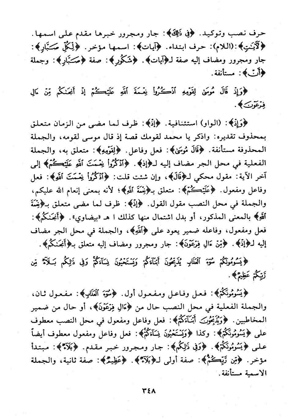 {وَإِذْ}: (الواو) استئنافية. {إِذْ}: ظرف لما مضى من الزمان متعلق بمحذوف تقديره: واذكر يا محمد لقومك قصة إذ قال موسى لقومه، والجملة المحذوفة مستأنفة. {قَالَ مُوسَى}: فعل وفاعل. {لِقَوْمِهِ}: متعلق به، والجملة الفعلية في محل الجر مضاف إليه لـ {إِذْ}. {اذْكُرُوا نِعْمَةَ اللَّهِ عَلَيْكُمْ} إلى آخر الآية: مقول محكي لـ {قَالَ}، وإن شئت قلت: {اذْكُرُوا نِعْمَةَ اللَّهِ}: فعل وفاعل ومفعول. {عَلَيْكُمْ}: متعلق بـ {نِعْمَةَ اللَّهِ}؛ لأنه بمعنى إنعام الله عليكم، والجملة في محل النصب مقول القول. {إِذْ}: ظرف لما مضى متعلق بـ {نِعْمَةَ اللَّهِ} بالمعنى المذكور، أو بدل اشتمال منها كذلك اهـ. "بيضاوي". {أَنْجَاكُمْ}: فعل ومفعول، وفاعله ضمير يعود على {اللَّهِ}، والجملة في محل الجر مضاف إليه لـ {إِذْ}. {مِنْ آلِ فِرْعَوْنَ}: جار ومجرور ومضاف إليه متعلق بـ {أَنْجَاكُمْ}.