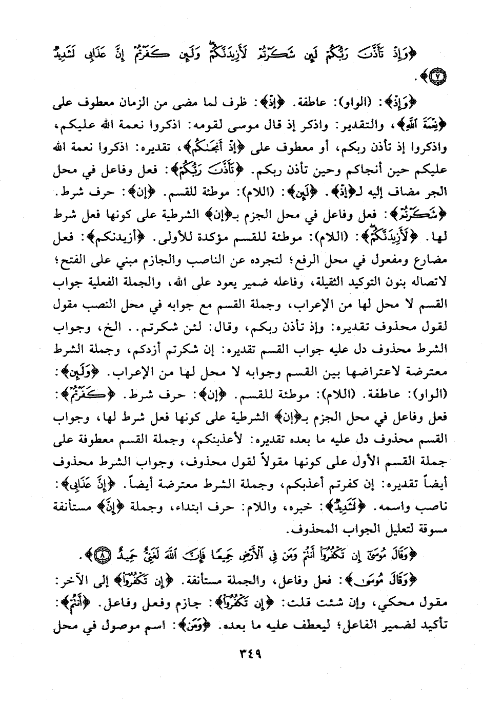{وَإِذْ}: (الواو): عاطفة. {إِذْ}: ظرف لما مضى من الزمان معطوف على {نِعْمَةَ اللَّهِ}، والتقدير: واذكر إذ قال موسى لقومه: اذكروا نعمة الله عليكم، واذكروا إذ تأذن ربكم، أو معطوف على {إِذْ أَنْجَاكُمْ}، تقديره: اذكروا نعمة الله عليكم حين أنجاكم وحين تأذن ربكم. {تَأَذَّنَ رَبُّكُمْ}: فعل وفاعل في محل الجر مضاف إليه {إذ}. {لَئِنْ}: (اللام): موطئة للقسم. {إن}: حرف شرط. {شَكَرْتُمْ}: فعل وفاعل في محل الجزم بـ {إن} الشرطية على كونها فعل شرط لها. {لَأَزِيدَنَّكُمْ}: (اللام): موطئة للقسم مؤكدة للأولى. {أَزِيدَنَّكُمْ}: فعل مضارع ومفعول في محل الرفع؛ لتجرده عن الناصب والجازم مبني على الفتح؛ لاتصاله بنون التوكيد الثقيلة، وفاعله ضمير يعود على الله، والجملة الفعلية جواب القسم لا محل لها من الإعراب، وجملة القسم مع جوابه في محل النصب مقول لقول محذوف تقديره: وإذ تأذن ربكم، وقال: لئن شكرتم .. الخ، وجواب الشرط محذوف دل عليه جواب القسم تقديره: إن شكرتم أزدكم، وجملة الشرط معترضة لاعتراضها بين القسم وجوابه لا محل لها من الإعراب. {وَلَئِنْ}: (الواو): عاطفة. (اللام): موطئة للقسم. {إن}: حرف شرط. {كَفَرْتُمْ}: فعل وفاعل في محل الجزم بـ {إن} الشرطية على كونها فعل شرط لها، وجواب القسم محذوف دل عليه ما بعده تقديره: لأعذبنكم، وجملة القسم معطوفة على جملة القسم الأول على كونها مقولًا لقول محذوف، وجواب الشرط محذوف أيضًا تقديره: إن كفرتم أعذبكم، وجملة الشرط معترضة أيضًا. {إِنَّ عَذَابِي}: ناصب واسمه. {لَشَدِيدٌ}: خبره، واللام: حرف ابتداء، وجملة {إِنَّ} مستأنفة مسوقة لعليل الجواب المحذوف.