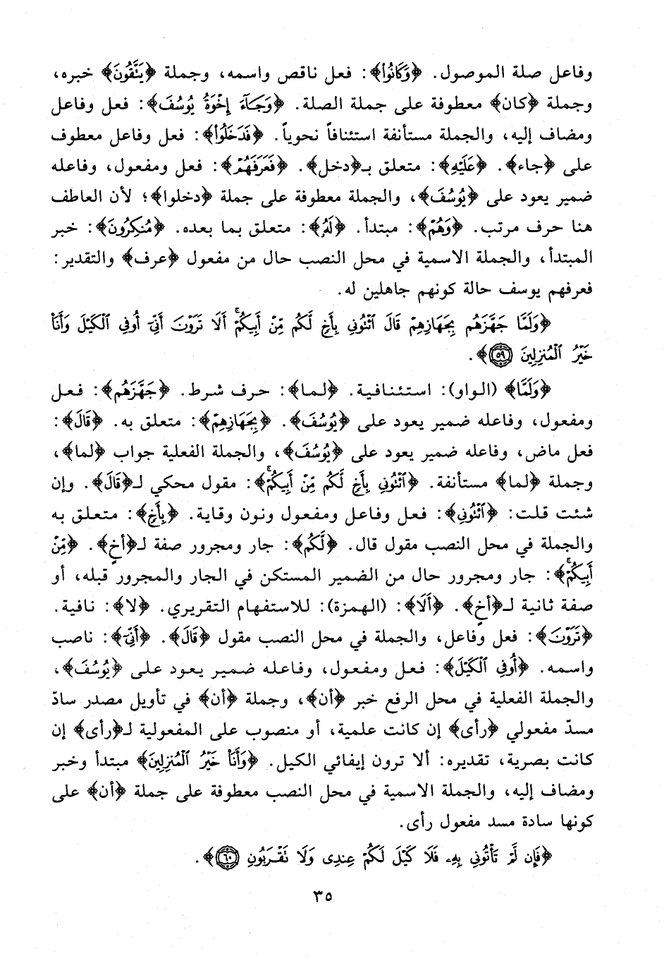 {وَلَمَّا} (الواو): استئنافية. {لما}: حرف شرط. {جَهَّزَهُمْ}: فعل ومفعول، وفاعله ضمير يعود على {يُوسُفَ}. {بجهازهم}: متعلق به. {قَالَ}: فعل ماض، وفاعله ضمير يعود على {يُوسُفَ}، والجملة الفعلية جواب {لما}، وجملة {لما} مستأنفة. {ائْتُونِي بِأَخٍ لَكُمْ مِنْ أَبِيكُمْ}: مقول محكي لـ {قَالَ}. وإن شئت قلت: {ائْتُونِي}: فعل وفاعل ومفعول ونون وقاية. {بِأَخٍ}: متعلق به والجملة في محل النصب مقول قال. {لكُم}: جار ومجرور صفة لـ {أخٍ}. {مِنْ أَبِيكُمْ}: جار ومجرور حال من الضمير المستكن في الجار والمجرور قبله، أو صفة ثانية لـ {أخٍ}. {أَلَا}: (الهمزة): للاستفهام التقريري. {لا}: نافية. {تَرَوْنَ}: فعل وفاعل، والجملة في محل النصب مقول {قَالَ}. {أنِّي}: ناصب واسمه. {أُوفِي الْكَيْلَ}: فعل ومفعول، وفاعله ضمير يعود على {يُوسُفَ}، والجملة الفعلية في محل الرفع خبر {أن}، وجملة {أن} في تأويل مصدر سادّ مسدّ مفعولي {رأى} إن كانت علمية، أو منصوب على المفعولية لـ {رأى} إن كانت بصرية، تقديره: ألا ترون إيفائي الكيل. {وَأَنَا خَيْرُ الْمُنْزِلِينَ} مبتدأ وخبر ومضاف إليه، والجملة الاسمية في محل النصب معطوفة على جملة {أن} على كونها سادة مسد مفعول رأى.
