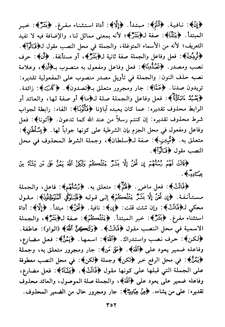 {إِنْ}: نافية. {أَنْتُمْ}: مبتدأ. {إِلَّا}: أداة استثناء مفرغ. {بَشَرٌ}: خبر المبتدأ. {مِثْلُنَا}: صفة لـ {بَشَرٌ}؛ لأنه بمعنى مماثل لنا، والإضافة فيه لا تفيد التعريف؛ لأنه من الأسماء المتوغلة، والجملة في محل النصب مقول لـ {قَالُوا}. {تُرِيدُونَ}: فعل وفاعل والجملة صفة ثانية لـ {بَشَرٌ}، أو مستأنفة. {أَنْ}: حرف نصب ومصدر. {تَصُدُّونَا}: فعل وفاعل ومفعول به منصوب بـ {أَنْ}، وعلامة نصبه حذف النون: والجملة في تأويل مصدر منصوب على المفعولية تقديره: تريدون صدنا. {عَمَّا}: جار ومجرور متعلق بـ {تَصُدُّون}. {كَانَ}: زائدة. {يَعْبُدُ آبَاؤُنَا}: فعل وفاعل والجملة صلة لـ {ما} أو صفة لها، والعائد أو الرابط محذوف تقديره: عما كان يعبده آباؤنا {فَأْتُونَا}: الفاء: رابطة لجواب شرط محذوف تقديره: إن كنتم رسلًا من عند الله كما تدعون. {أْتُونَا}: فعل وفاعل ومفعول في محل الجزم بإن الشرطية على كونا جوابًا لها. {بِسُلْطَانٍ}: متعلق به. {مُبِينٍ}: صفة لـ {سُلْطَانٍ}، وجملة الشرط المحذوف في محل النصب مقول {قَالُوا}.