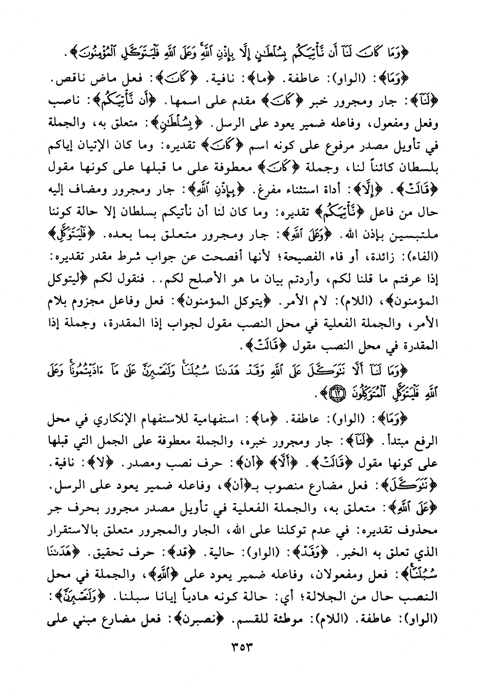{وَمَا}: (الواو): عاطفة. {ما}: نافية. {كَانَ}: فعل ماض ناقص. {لَنَا}: جار ومجرور خبر {كَانَ} مقدم على اسمها. {أَنْ نَأْتِيَكُمْ}: ناصب وفعل ومفعول، وفاعله ضمير يعود على الرسل. {بِسُلْطَانٍ}: متعلق به، والجملة في تأويل مصدر مرفوع على كونه اسم {كَانَ} تقديره: وما كان الإتيان إياكم بلسطان كائنًا لنا، وجملة {كَانَ} معطوفة على ما قبلها على كونها مقول {قَالَتْ}. {إِلَّا}: أداة استثناء مفرغ. {بِإِذْنِ}: جار ومجرور ومضاف إليه حال من فاعل {نَأْتِيَكُمْ} تقديره: وما كان لنا أن نأتيكم بسلطان إلا حالة كوننا ملتبسين بإذن الله. {وَعَلَى اللَّهِ}: جار ومجرور متعلق بما بعده. {فَلْيَتَوَكَّلِ} (الفاء): زائدة، أو فاء الفصيحة؛ لأنها أفصحت عن جواب شرط مقدر تقديره: إذا عرفتم ما قلنا لكم، وأردتم بيان ما هو الأصلح لكم .. فنقول لكم {ليَتَوَكَّلِ الْمُؤْمِنُونَ}، (اللام): لام الأمر. {يتوكل المؤمنون}: فعل وفاعل مجزوم بلام الأمر، والجملة الفعلية في محل النصب مقول لجواب إذا المقدرة، وجملة إذا المقدرة في محل النصب مقول {قَالَتْ}.