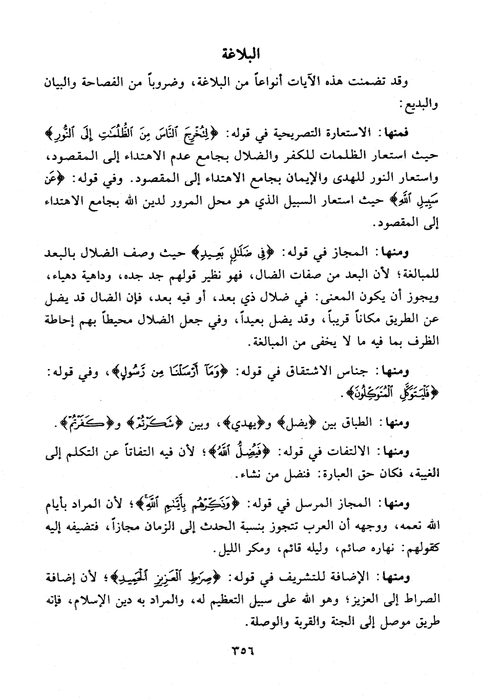 وقد تضمنت هذه الآيات أنواعًا من البلاغة، وضروبًا من الفصاحة والبيان والبديع. فمنها: الاستعارة التصريحية في قوله: {لِتُخْرِجَ النَّاسَ مِنَ الظُّلُمَاتِ إِلَى النُّورِ} حيث استعار الظلمات للكفر والضلال بجامع عدم الاهتداء إلى المقصود، واستعار النور للهدى والإيمان بجامع الاهتداء إلى المقصود. وفي قوله: {عَنْ سَبِيلِ اللَّهِ} حيث استعار السبيل الذي هو محل المرور لدين الله بجامع الاهتداء إلى المقصود.