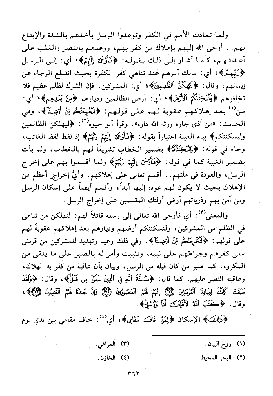 والمعنى (¬3): أي فأوحى الله تعالى إلى رسله قائلًا لهم: لنهلكن من تناهى في الظلم من المشركين، ولنسكننكم أرضهم وديارهم بعد إهلاكهم عقوبةً لهم على قولهم: {لَنُخْرِجَنَّكُمْ مِنْ أَرْضِنَا}. وفي ذلك وعيد وتهديد للمشركين من قريش على كفرهم وجراءتهم على نبيه، وتثبيت وأمر له بالصبر على ما يلقى من المكروه، كما صبر من كان قبله من الرسل، وبيان بأن عاقبة من كفر به الهلاك، وعاقبته النصر عليهم، كما قال: {سُنَّةَ اللَّهِ فِي الَّذِينَ خَلَوْا مِنْ قَبْلُ}، وقال: {وَلَقَدْ سَبَقَتْ كَلِمَتُنَا لِعِبَادِنَا الْمُرْسَلِينَ (171) إِنَّهُمْ لَهُمُ الْمَنْصُورُونَ (172) وَإِنَّ جُنْدَنَا لَهُمُ الْغَالِبُونَ (173)}، وقال: {كَتَبَ اللَّهُ لَأَغْلِبَنَّ أَنَا وَرُسُلِي}.