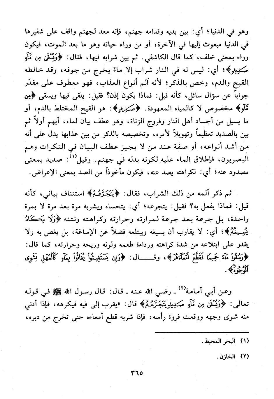 وعن أبي أمامة (¬2) - رضي الله عنه - قال: قال رسول الله - صلى الله عليه وسلم - في قوله تعالى: {وَيُسْقَى مِنْ مَاءٍ صَدِيدٍ يَتَجَرَّعُهُ} قال: "يقرب إلى فيه فيكرهه، فإذا أدني منه شوى وجهه ووقعت فروة رأسه، فإذا شعر به قطع أمعاءه حتى تخرج عن دبره،