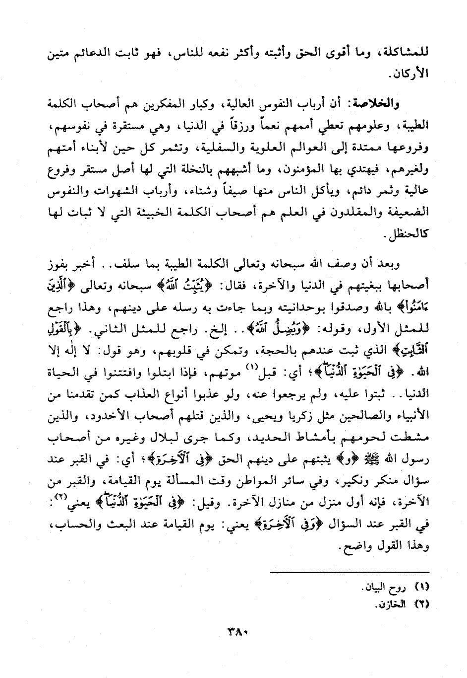 والخلاصة: أن أرباب النفوس العالية، وكبار الفكرين هم أصحاب الكلمة الطيبة، وعلومهم تعطي أممهم نعمًا ورزقًا في الدنيا، وهي مستقرة في نفوسهم، وفروعها ممتدة إلى العوالم العلوية والسفلية، وتثمر كل حين لأبناء أمتهم ولغيرهم، فيهتدي بها المؤمنون، وما أشبههم بالنخلة التي لها أصل مستقر وفروع عالية وثمر دائم، ويأكل الناس منها صيفًا وشتاء، وأرباب الشهوات والنفوس الضعيفة والمقلدون في العلم هم أصحاب الكلمة الخبيثة التي لا ثبات لها كالحنظل.