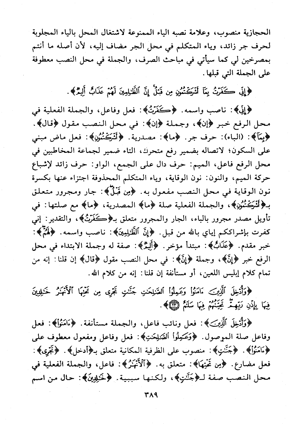 {إِنِّي}: ناصب واسمه. {كَفَرْتُ}: فعل وفاعل، والجملة الفعلية في محل الرفع خبر {إن}، وجملة {إن}: في محل النصب مقول {قَالَ}، {بِمَا}: (الباء): حرف جر. {ما}: مصدرية. {أَشْرَكْتُمُونِ}: فعل ماض مبني على السكون؛ لاتصاله بضمير رفع متحرك، التاء ضمير لجماعة المخاطبين في محل الرفع فاعل، الميم: حرف دال على الجمع، الواو: حرف زائد لإشباع حركة الميم، والنون: نون الوقاية، وياء المتكلم المحذوفة اجتزاء عنها بكسرة نون الوقاية في محل النصب مفعول به. {مِنْ قَبْلُ}: جار ومجرور متعلق بـ {أَشْرَكْتُمُونِ}، والجملة الفعلية صلة {ما} المصدرية، {ما} مع صلتها: في تأويل مصدر مجرور بالباء، الجار والمجرور متعلق بـ {كَفَرْتُ}، والتقدير: إني كفرت بإشراككم إياي بالله من قبل. {إِنَّ الظَّالِمِينَ}: ناصب واسمه. {لَهُمْ}: خبر مقدم. {عَذَابٌ}: مبتدأ مؤخر. {أَلِيمٌ}: صفة له وجملة الابتداء في محل الرفع خبر {إِنَّ}، وجملة {إنَّ}: في محل النصب مقول {قال} إن قلنا: إنه من تمام كلام إبليس اللعين، أو مستأنفة إن قلنا: إنه من كلام الله.