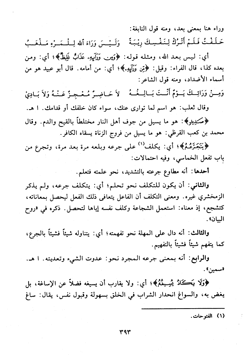 {يَتَجَرَّعُهُ}؛ أي: يكلف (¬1) على جرعه وبلعه مرة بعد مرة، وتجرع من باب تفعل الخماسي، وفيه احتمالات: