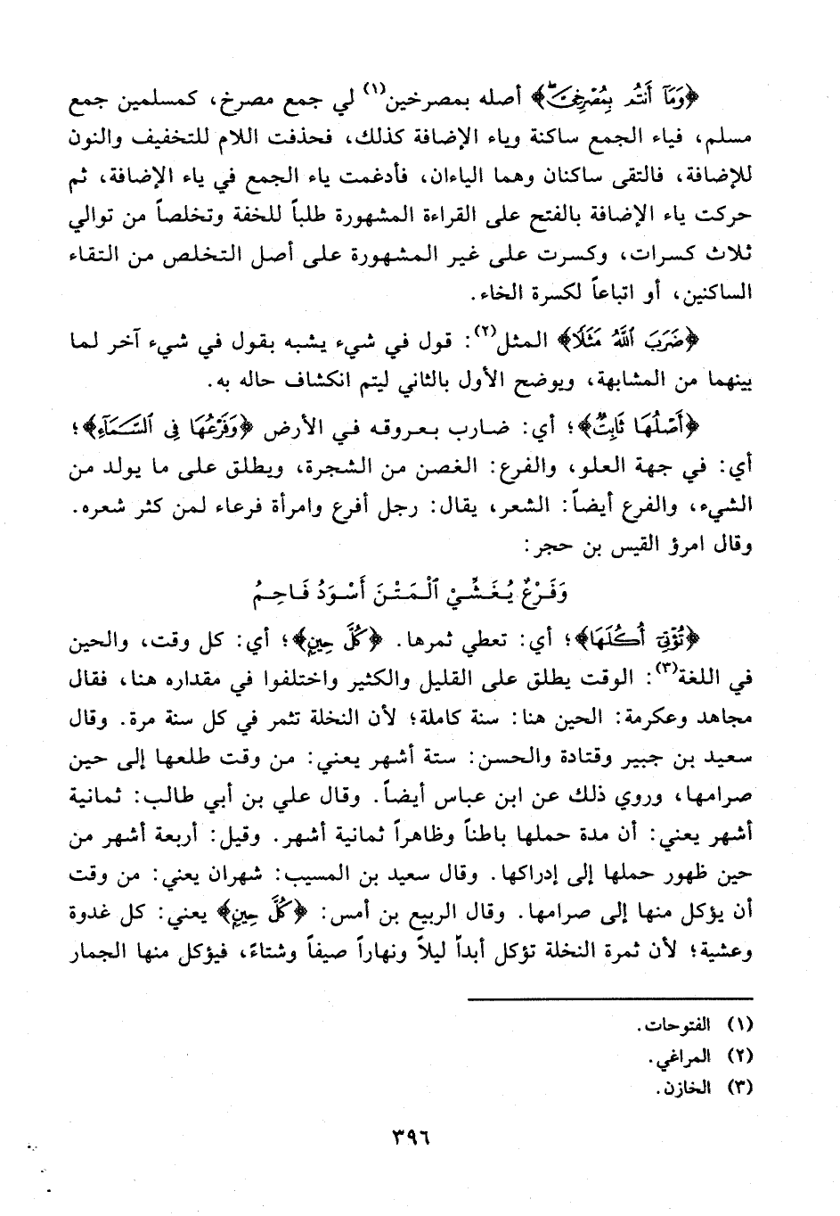 {تُؤْتِي أُكُلَهَا}؛ أي: تعطي ثمرها. {كُلَّ حِينٍ}؛ أي: كل وقت، والحين في اللغة (¬3): الوقت يطلق على القليل والكثير واختلفوا في مقداره هنا، فقال مجاهد وعكرمة: الحين هنا: سنة كاملة؛ لأن النخلة تثمر في كل سنة مرة. وقال سعيد بن جبير وقتادة والحسن: ستة أشهر يعني: من وقت طلعها إلى حين صرامها، وروي ذلك عن ابن عباس أيضًا. وقال علي بن أبي طالب: ثمانية أشهر يعني: أن مدة حصلها باطنًا وظاهرًا ثمانية أشهر. وقيل: أربعة أشهر من حين ظهور حملها إلى إدراكها. وقال سعيد بن المسيب: شهران يعني: من وقت أن يؤكل منها إلى صرامها. وقال الربيع بن أمس: {كُلَّ حِينٍ} يعني: كل غدوة وعشية؛ لأن ثمرة النخلة تؤكل أبدًا ليلًا ونهارًا صيفًا وشتاءً، فيؤكل منها الجمار