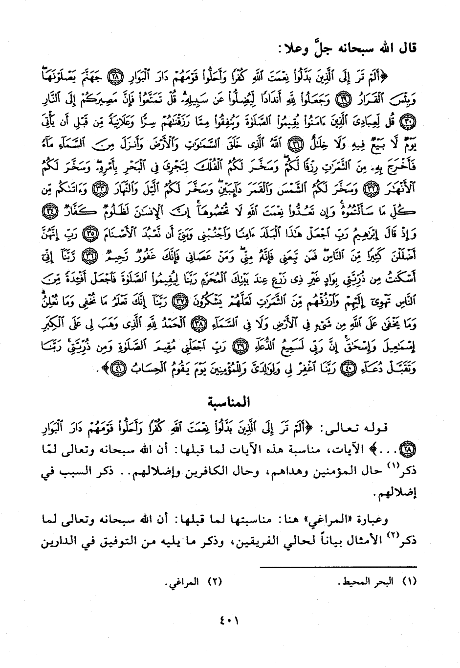 {أَلَمْ تَرَ إِلَى الَّذِينَ بَدَّلُوا نِعْمَتَ اللَّهِ كُفْرًا وَأَحَلُّوا قَوْمَهُمْ دَارَ الْبَوَارِ (28) جَهَنَّمَ يَصْلَوْنَهَا وَبِئْسَ الْقَرَارُ (29) وَجَعَلُوا لِلَّهِ أَنْدَادًا لِيُضِلُّوا عَنْ سَبِيلِهِ قُلْ تَمَتَّعُوا فَإِنَّ مَصِيرَكُمْ إِلَى النَّارِ (30) قُلْ لِعِبَادِيَ الَّذِينَ آمَنُوا يُقِيمُوا الصَّلَاةَ وَيُنْفِقُوا مِمَّا رَزَقْنَاهُمْ سِرًّا وَعَلَانِيَةً مِنْ قَبْلِ أَنْ يَأْتِيَ يَوْمٌ لَا بَيْعٌ فِيهِ وَلَا خِلَالٌ (31) اللَّهُ الَّذِي خَلَقَ السَّمَاوَاتِ وَالْأَرْضَ وَأَنْزَلَ مِنَ السَّمَاءِ مَاءً فَأَخْرَجَ بِهِ مِنَ الثَّمَرَاتِ رِزْقًا لَكُمْ وَسَخَّرَ لَكُمُ الْفُلْكَ لِتَجْرِيَ فِي الْبَحْرِ بِأَمْرِهِ وَسَخَّرَ لَكُمُ الْأَنْهَارَ (32) وَسَخَّرَ لَكُمُ الشَّمْسَ وَالْقَمَرَ دَائِبَيْنِ وَسَخَّرَ لَكُمُ اللَّيْلَ وَالنَّهَارَ (33) وَآتَاكُمْ مِنْ كُلِّ مَا سَأَلْتُمُوهُ وَإِنْ تَعُدُّوا نِعْمَتَ اللَّهِ لَا تُحْصُوهَا إِنَّ الْإِنْسَانَ لَظَلُومٌ كَفَّارٌ (34) وَإِذْ قَالَ إِبْرَاهِيمُ رَبِّ اجْعَلْ هَذَا الْبَلَدَ آمِنًا وَاجْنُبْنِي وَبَنِيَّ أَنْ نَعْبُدَ الْأَصْنَامَ (35) رَبِّ إِنَّهُنَّ أَضْلَلْنَ كَثِيرًا مِنَ النَّاسِ فَمَنْ تَبِعَنِي فَإِنَّهُ مِنِّي وَمَنْ عَصَانِي فَإِنَّكَ غَفُورٌ رَحِيمٌ (36) رَبَّنَا إِنِّي أَسْكَنْتُ مِنْ ذُرِّيَّتِي بِوَادٍ غَيْرِ ذِي زَرْعٍ عِنْدَ بَيْتِكَ الْمُحَرَّمِ رَبَّنَا لِيُقِيمُوا الصَّلَاةَ فَاجْعَلْ أَفْئِدَةً مِنَ النَّاسِ تَهْوِي إِلَيْهِمْ وَارْزُقْهُمْ مِنَ الثَّمَرَاتِ لَعَلَّهُمْ يَشْكُرُونَ (37) رَبَّنَا إِنَّكَ تَعْلَمُ مَا نُخْفِي وَمَا نُعْلِنُ وَمَا يَخْفَى عَلَى اللَّهِ مِنْ شَيْءٍ فِي الْأَرْضِ وَلَا فِي السَّمَاءِ (38) الْحَمْدُ لِلَّهِ الَّذِي وَهَبَ لِي عَلَى الْكِبَرِ إِسْمَاعِيلَ وَإِسْحَاقَ إِنَّ رَبِّي لَسَمِيعُ الدُّعَاءِ (39) رَبِّ اجْعَلْنِي مُقِيمَ الصَّلَاةِ وَمِنْ ذُرِّيَّتِي رَبَّنَا وَتَقَبَّلْ دُعَاءِ (40) رَبَّنَا اغْفِرْ لِي وَلِوَالِدَيَّ وَلِلْمُؤْمِنِينَ يَوْمَ يَقُومُ الْحِسَابُ (41)}.