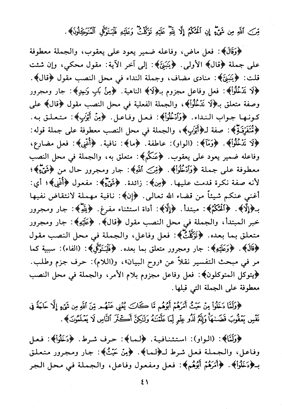 {وَقَالَ}: فعل ماض، وفاعله ضمير يعود على يعقوب، والجملة معطوفة على جملة {قال} الأولى. {يَا بَنِيَّ}: إلى آخر الآية: مقول محكي، وإن شئت قلت: {يَا بَنِيَّ}: منادى مضاف، وجملة النداء في محل النصب مقول {قال}. {لَا تَدْخُلُوا}: فعل وفاعل مجزوم بـ {لَا} الناهية. {مِنْ بَابٍ وَاحِدٍ}: جار ومجرور وصفة متعلق بـ {لَا تَدْخُلُوا}، والجملة الفعلية في محل النصب مقول {قال} على كونها جواب النداء. {وَادْخُلُوا}: فعل وفاعل. {مِنْ أَبْوَابٍ}: متعلق به. {مُتَفَرِّقَةٍ}: صفة لـ {أَبْوَابٍ}، والجملة في محل النصب معطوفة على جملة قوله: {لَا تَدْخُلُوا}. {وَمَا}: (الواو): عاطفة. {ما}: نافية. {أُغْنِي}: فعل مضارع، وفاعله ضمير يعود على يعقوب. {عَنْكُمْ}: متعلق به، والجملة في محل النصب معطوفة على جملة {وَادْخُلُوا}. {مِنَ اللَّهِ}: جار ومجرور حال من {شَيْءٍ}؛ لأنه صفة نكرة قدمت عليها. {مِنْ}: زاندة. {شَيْءٍ}: مفعول {أُغْنِي}؛ أي: أغني عنكم شيئًا من قضاء الله تعالى. {إِن}: نافية مهملة لانتقاض نفيها بـ {إِلَّا}. {الْحُكْمُ}: مبتدأ. {إلَّا}: أداة استثناء مفرغ. {لِلَّهِ}: جار ومجرور خبر المبتدأ، والجملة في محل النصب مقول (قال). {عَلَيْهِ}: جار ومجرور متعلق بما بعده. {تَوَكَّلْتُ}: فعل وفاعل، والجملة في محل النصب مقول {قَالَ}. {وَعَلَيْهِ}: جار ومجرور متعلق بما بعده. {فَلْيَتَوَكَّلِ}: {الفاء}: سببية كما مر في مبحث التفسير نقلًا عن "روح البيان"، و (اللام): حرف جزم وطلب. {يتوكل المتوكلون}: فعل وفاعل مجزوم بلام الأمر، والجملة في محل النصب معطوفة على الجملة التي قبلها.