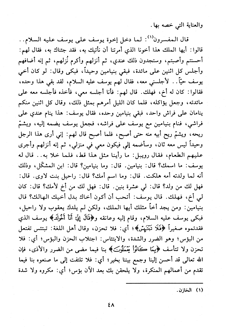 قال المفسرون (¬1): لما دخل إخوة يوسف على يوسف عليه السلام .. قالوا: أيها الملك هذا أخبرنا الذي أمرتنا أن نأتيك به، فقد جئناك به، فقال لهم: أحسنتم وأصبتم، وستجدون ذلك عندي، ثم أنزلهم وأكرم نُزلهم، ثم إنه أضافهم وأجلس كل اثنين على مائدة، فبقي بنيامين وحيدًا، فبكى وقال: لو كان أخي يوسف حيًّا .. لأجلسني معه، فقال لهم يوسف عليه السلام، لقد بقي هذا وحده، فقالوا: كان له أخ، فهلك. قال لهم: فأنا أجلسه معي، فأخذه فأجلسه معه على مائدته، وجعل يؤاكله، فلما كان الليل أمرهم بمثل ذلك، وقال كل اثنين منكم ينامان على فراش واحد، فبقي بنيامين وحده، فقال يوسف: هذا ينام عندي على فراشي، فنام بنيامين مع يوسف على فراشه، فجعل يوسف يضمه إليه، ويشمّ ريحه، ويشمّ ريح أبيه منه حتى أصبح، فلما أصبح قال لهم: إني أرى هذا الرجل وحيدًا ليس معه ثان، وسأضمه إلي فيكون معي في منزلي، ثم إنه أنزلهم وأجرى عليهم الطعام، فقال رويبل: ما رأينا مثل هذا قط، فلما خلا به .. قال له يوسف: ما اسمك؟ قال: بنيامين. قال: وما بنيامين؟ قال: ابن المشكّل، وذلك أنه لما ولدته أمه هلكت. قال: وما اسم أمك؟ قال: راحيل بنت لاوى. قال: فهل لك من ولد؟ قال: لي عشرة بنين. قال: فهل لك من أخ لأمك؟ قال: كان لي أخ، فهلك. قال يوسف: أتحب أن أكون أخاك بدل أخيك الهالك؟ قال بنيامين: ومن يجد أخًا مثلك أيها الملك، ولكن لم يلدك يعقوب ولا راحيل، فبكى يوسف عليه السلام، وقام إليه وعانقه و {قَالَ إِنِّي أَنَا أَخُوكَ} يوسف الذي فقدتموه صغيرًا {فَلَا تَبْتَئِسْ}؛ أي: فلا تحزن، وقال أهل اللغة: تبتئس تفتعل من البؤس؛ وهو الضرر والشدة، والابتئاس: اجتلاب الحزن والبؤس؛ أي: فلا تحزن ولا تتأسف {بِمَا كَانُوا يَعْمَلُونَ} بنا فيما مضى من الضرر والأذى، فإن الله تعالى قد أحسن إلينا وجمع بيننا بخير؛ أي: فلا تلتفت إلى ما صنعوه بنا فيما تقدم من أعمالهم المنكرة، ولا يلحقن بك بعد الآن بؤس؛ أي: مكروه ولا شدة