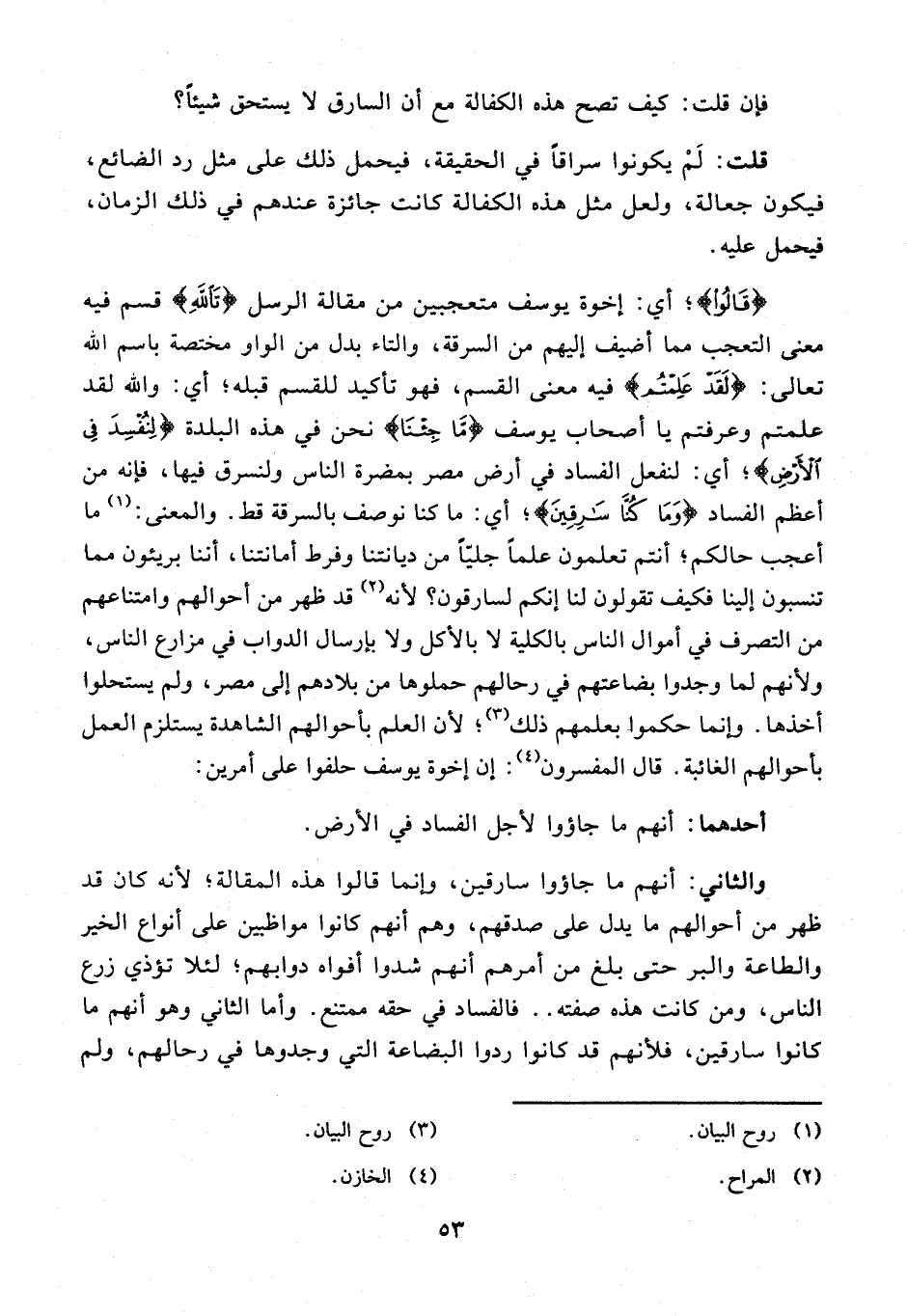 والثاني: أنهم ما جاؤوا سارقين، وإنما قالوا هذه المقالة؛ لأنه كان قد ظهر من أحوالهم ما يدل على صدقهم، وهم أنهم كانوا مواظبين على أنواع الخير والطاعة والبر حتى بلغ من أمرهم أنهم شدوا أفواه دوابهم؛ لئلا تؤذي زرع الناس، ومن كانت هذه صفته .. فالفساد في حقه ممتنع. وأما الثاني وهو أنهم ما كانوا سارقين، فلأنهم قد كانوا ردوا البضاعة التي وجدوها في رحالهم، ولم