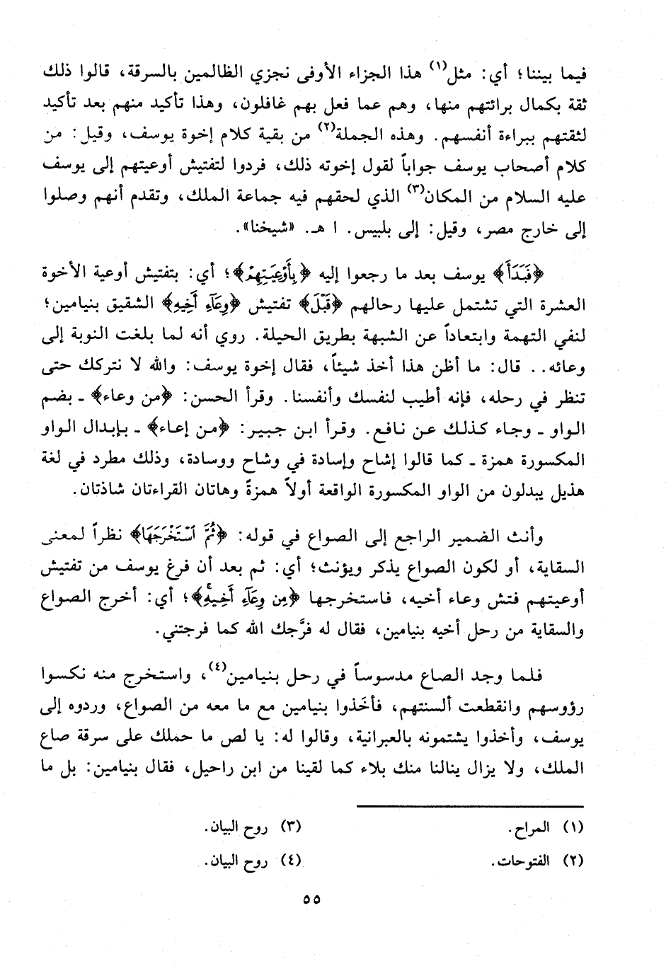 وأنث الضمير الراجع إلى الصواع في قوله: {ثُمَّ اسْتَخْرَجَهَا} نظرًا لمعنى السقاية، أو لكون الصواع يذكر ويؤنث؛ أي: ثم بعد أن فرغ يوسف من تفتيش أوعيتهم فتش وعاء أخيه، فاستخرجها {مِنْ وِعَاءِ أَخِيهِ}؛ أي: أخرج الصواع والسقاية من رحل أخيه بنيامين، فقال له فرَّجك الله كما فرجتني.