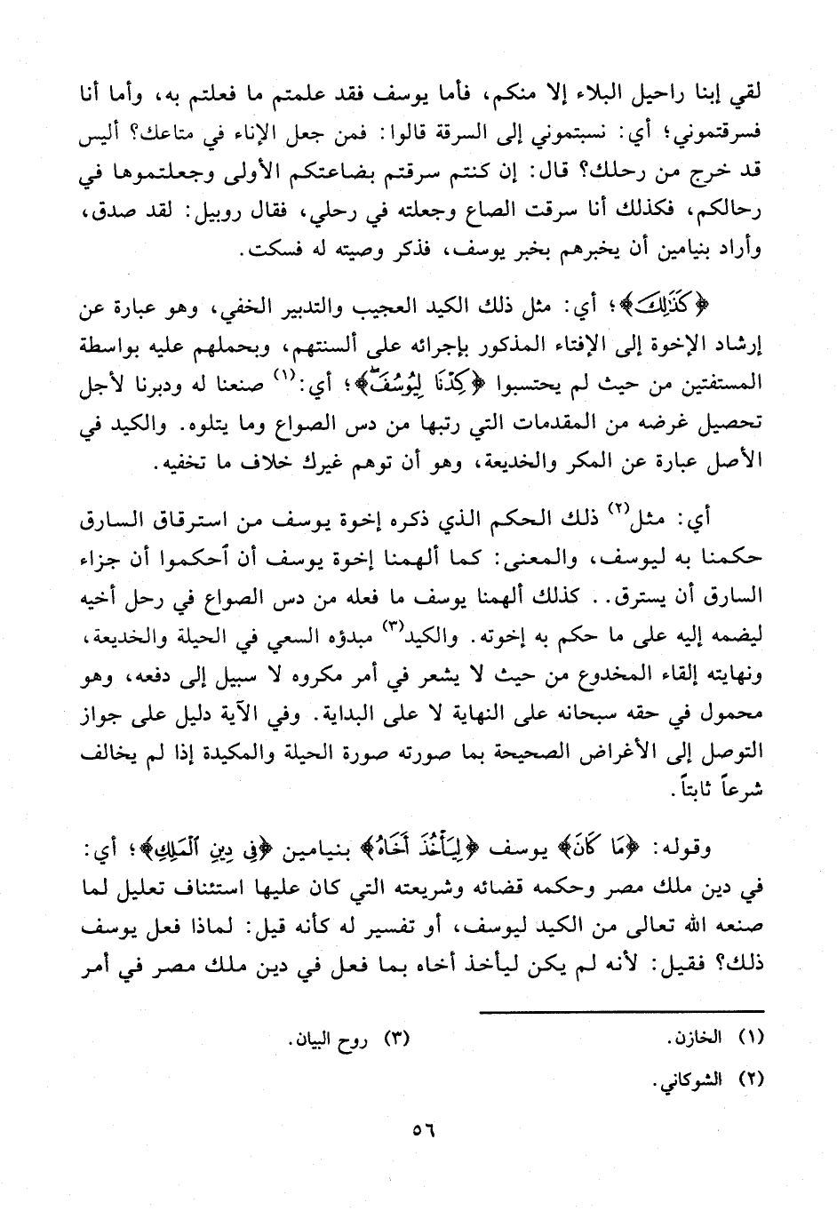 وقوله: {مَا كَانَ} يوسف {لِيَأْخُذَ أَخَاهُ} بنيامين {فِي دِينِ الْمَلِكِ}؛ أي: في دين ملك مصر وحكمه قضائه وشريعته التي كان عليها استئناف تعليل لما صنعه الله تعالى من الكيد ليوسف، أو تفسير له كأنه قيل: لماذا فعل يوسف ذلك؟ فقيل: لأنه لم يكن ليأخذ أخاه بما فعل في دين ملك مصر في أمر