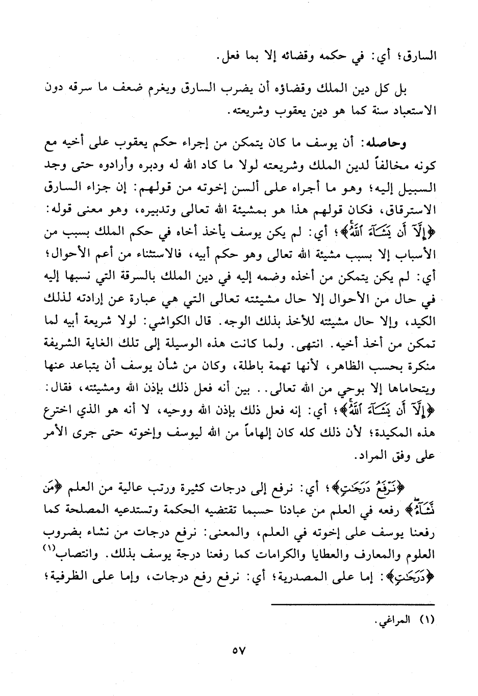 وحاصله: أن يوسف ما كان يتمكن من إجراء حكم يعقوب على أخيه مع كونه مخالفًا لدين الملك وشريعته لولا ما كاد الله له ودبره وأرادوه حتى وجد السبيل إليه؛ وهو ما أجراه على ألسن إخوته من قولهم: إن جزاء السارق الاسترقاق، فكان قولهم هذا هو بمشيئة الله تعالى وتدبيره، وهو معنى قوله: {إِلَّا أَنْ يَشَاءَ اللَّهُ}؛ أي: لم يكن يوسف يأخذ أخاه في حكم الملك بسبب من الأسباب إلا بسبب مشيئة الله تعالى وهو حكم أبيه، فالاستثناء من أعم الأحوال؛ أي: لم يكن يتمكن من أخذه وضمه إليه في دين الملك بالسرقة التي نسبها إليه في حال من الأحوال إلا حال مشيئته تعالى التي هي عبارة عن إرادته لذلك الكيد، وإلا حال مشيئته للأخذ بذلك الوجه. قال الكواشي: لولا شريعة أبيه لما تمكن من أخذ أخيه. انتهى. ولما كانت هذه الوسيلة إلى تلك الغاية الشريفة منكرة بحسب الظاهر؛ لأنها تهمة باطلة، وكان من شأن يوسف أن يتباعد عنها ويتحاماها إلا بوحي من الله تعالى .. بين أنه فعل ذلك بإذن الله ومشيئته، فقال: {إِلَّا أَنْ يَشَاءَ اللَّهُ}؛ أي: إنه فعل ذلك بإذن الله ووحيه، لا أنه هو الذي اخترع هذه المكيدة؛ لأن ذلك كله كان إلهامًا من الله ليوسف وإخوته حتى جرى الأمر على وفق المراد.