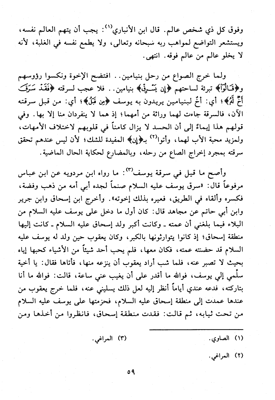 وأصح ما قيل في سرقة يوسف (¬3): ما رواه ابن مردويه عن ابن عباس مرفوعًا قال: "سرق يوسف عليه السلام صنمًا لجده أبي أمه من ذهب وفضة، فكسره وألقاه في الطريق، فعيره بذلك إخوته". وأخرج ابن إسحاق وابن جرير وابن أبي حاتم عن مجاهد قال: كان أول ما دخل على يوسف عليه السلام من البلاء فيما بلغني أن عمته - وكانت أكبر ولد إسحاق عليه السلام - كانت إليها منطقة إسحاق؛ إذ كانوا يتوارثونها بالكبر، وكان يعقوب حين ولد له يوسف عليه السلام قد حضنته عمته، فكان معها، فلم يحب أحد شيئًا من الأشياء كحبها إياه بحيث لا تصبر عنه، فلما شب أراد يعقوب أن ينزعه منها، فأتاها فقال: يا أخية سلِّمي إلى يوسف، فوالله ما أقدر على أن يغيب عني ساعة، قالت: فوالله ما أنا بتاركته، فدعه عندي أيامًا أنظر إليه لعل ذلك يسليني عنه، فلما خرج يعقوب من عندها عمدت إلى منطقة إسحاق عليه السلام، فحزمتها على يوسف عليه السلام من تحت ثيابه، ثم قالت: فقدت منطقة إسحاق، فانظروا من أخذها ومن