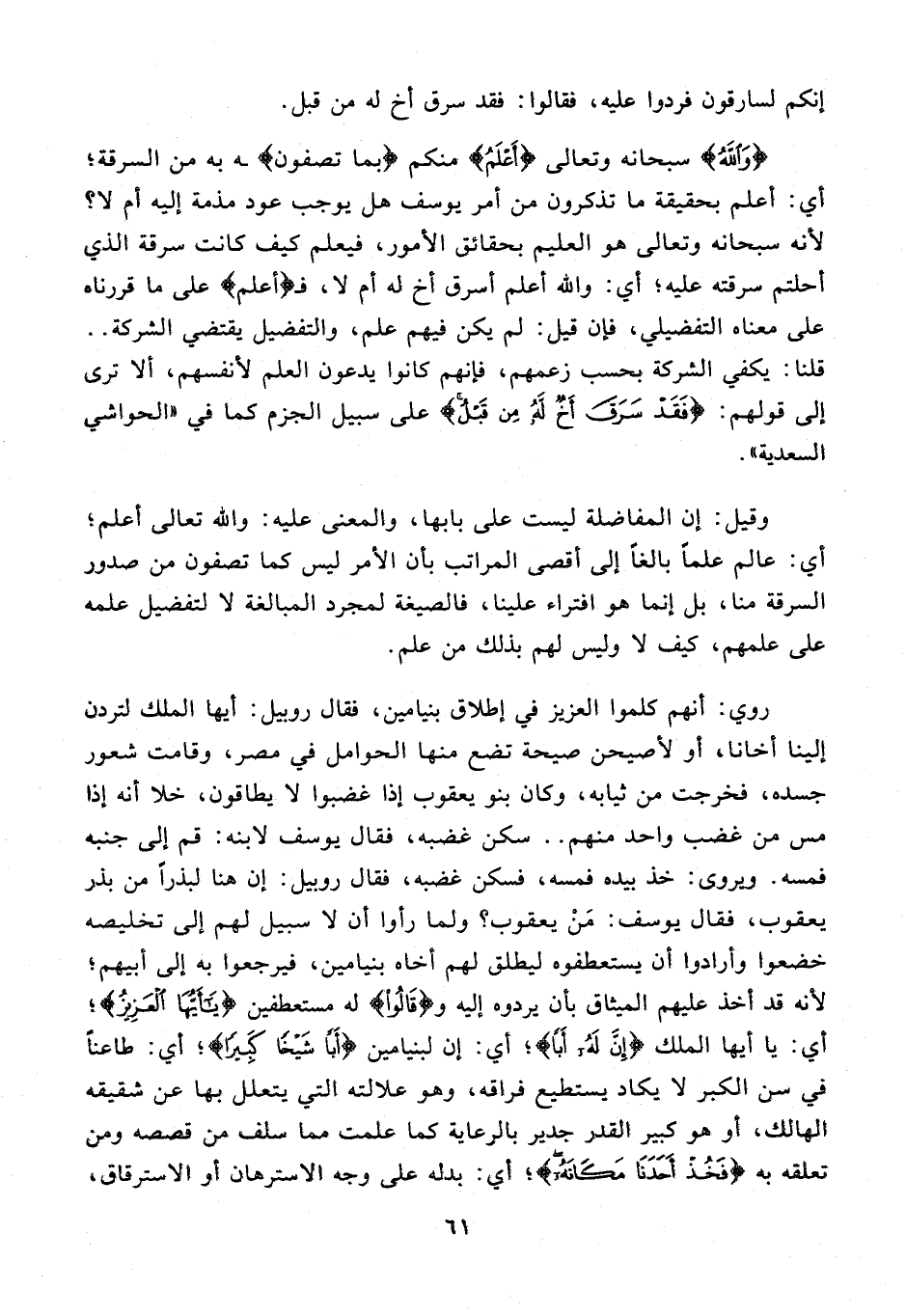 وقيل: إن المفاضلة ليست على بابها، والمعنى عليه: والله تعالى أعلم؛ أي: عالم علمًا بالغًا إلى أقصى المراتب بأن الأمر ليس كما تصفون من صدور السرقة منا، بل إنما هو افتراء علينا، فالصيغة لمجرد المبالغة لا لتفضيل علمه على علمهم، كيف لا وليس لهم بذلك من علم.