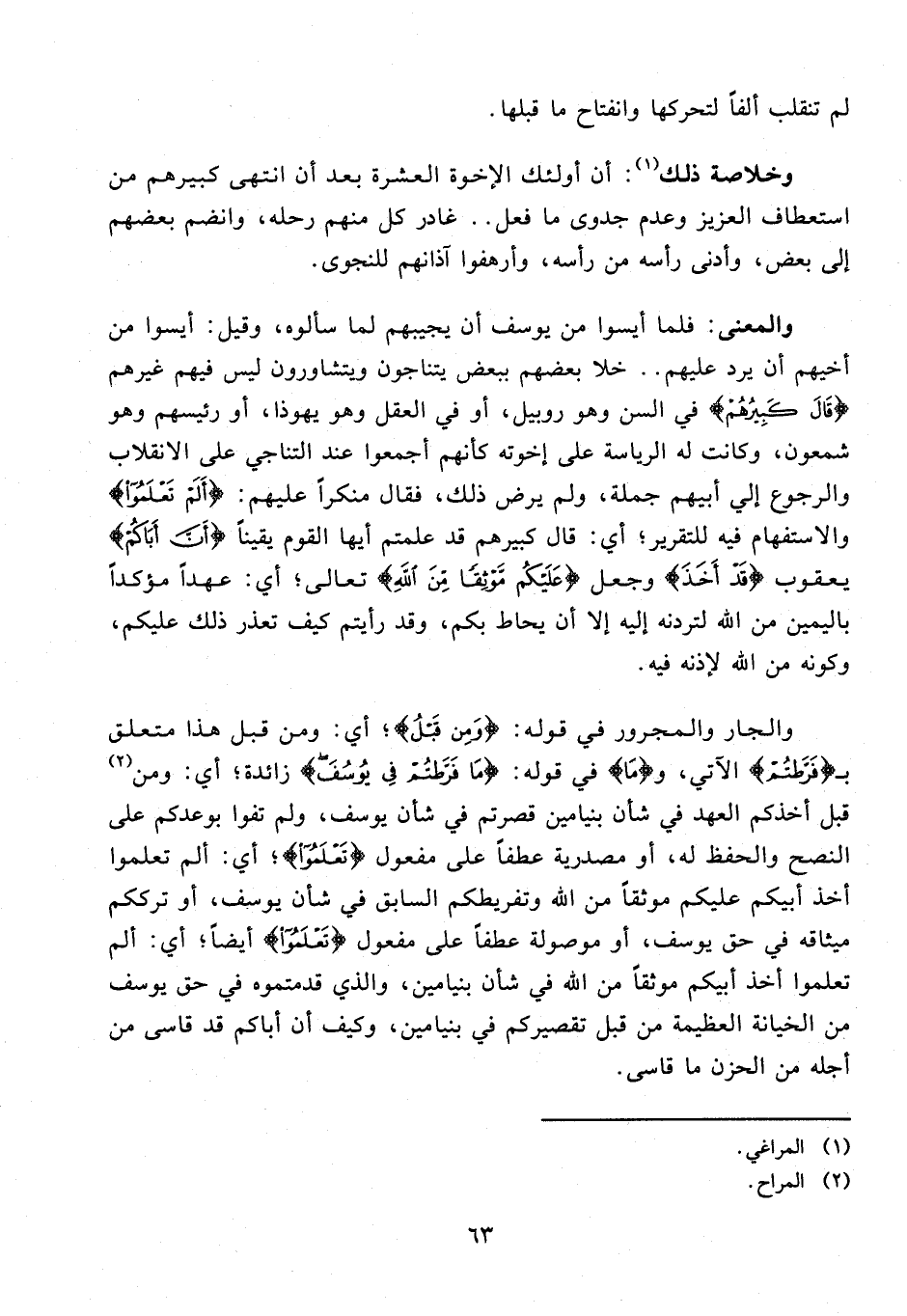 والجار والمجرور في قوله: {وَمِنْ قَبْلُ}؛ أي: ومن قبل هذا متعلق بـ {فَرَّطْتُم} الآتي، و {مَا} في قوله: {مَا فَرَّطْتُمْ فِي يُوسُفَ} زائدة؛ أي: ومن (¬2) قبل أخذكم العهد في شأن بنيامين قصرتم في شأن يوسف، ولم تفوا بوعدكم على النصح والحفظ له، أو مصدرية عطفًا على مفعول {تَعْلَمُوا}؛ أي: ألم تعلموا أخذ أبيكم عليكم موثقًا من الله وتفريطكم السابق في شأن يوسف، أو ترككم ميثاقه في حق يوسف، أو موصولة عطفًا على مفعول {تَعْلَمُوا} أيضًا؛ أي: ألم تعلموا أخذ أبيكم موثقًا من الله في شأن بنيامين، والذي قدمتموه في حق يوسف من الخيانة العظيمة من قبل تقصيركم في بنيامين، وكيف أن أباكم قد قاسى من أجله من الحزن ما قاسى.