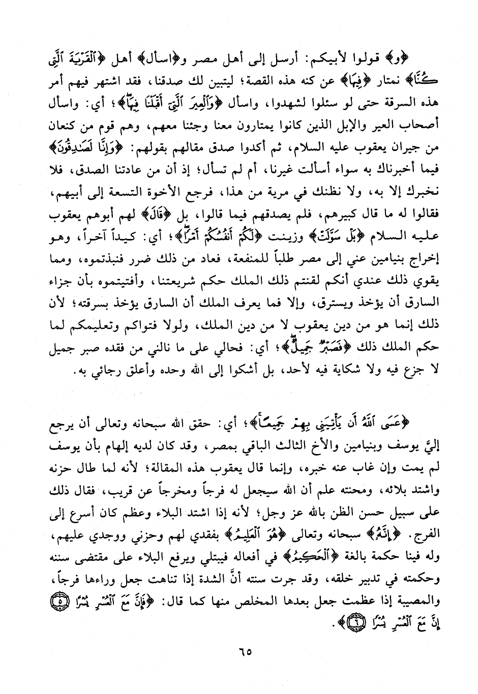 83 - بل {قاَلَ} لهم أبوهم يعقوب عليه السلام {بَلْ سَوَّلَتْ} وزينت {لَكُمْ أَنْفُسُكُمْ أَمْرًا}؛ أي: كيدًا آخرًا، وهو إخراج بنيامين عني إلى مصر طلبًا للمنفعة، فعاد من ذلك ضرر فنبذتموه، ومما يقوي ذلك عندي أنكم لقنتم ذلك الملك حكم شريعتنا، وأفتيتموه بأن جزاء السارق أن يؤخذ ويسترق، وإلا فما يعرف الملك أن السارق يؤخذ بسرقته؛ لأن ذلك إنما هو من دين يعقوب لا من دين الملك، ولولا فتواكم وتعليمكم لما حكم الملك ذلك {فَصَبْرٌ جَمِيلٌ}؛ أي: فحالي على ما نالني من فقده صبر جميل لا جزع فيه ولا شكاية فيه لأحد، بل أشكوا إلى الله وحده وأعلق رجائي به.