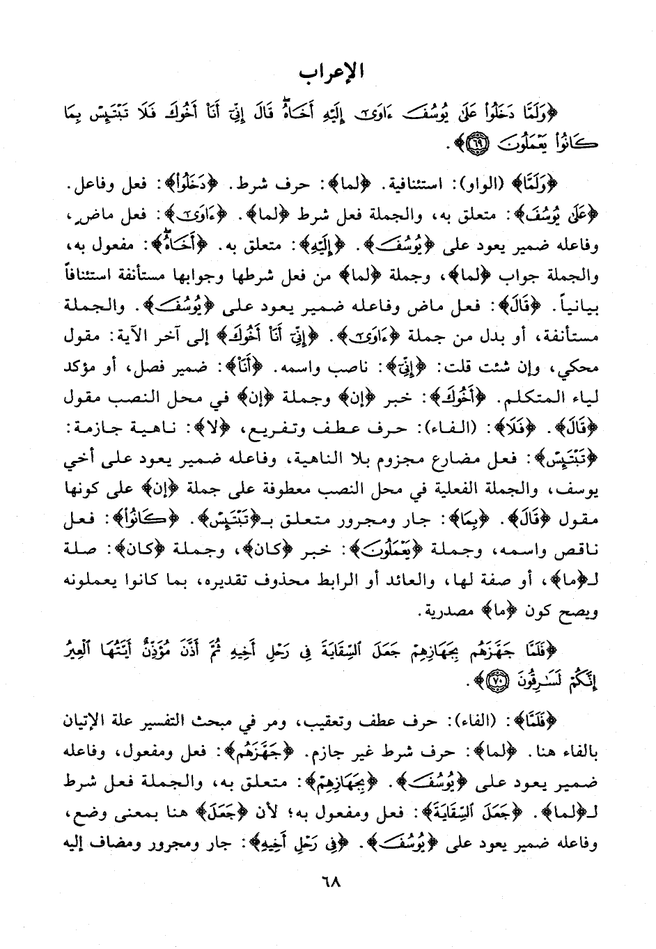 {وَلَمَّا} (الواو): استئنافية. {لما}: حرف شرط. {دَخَلُوا}؛ فعل وفاعل. {عَلَى يُوسُفَ}: متعلق به، والجملة فعل شرط {لما}. {آوَى}: فعل ماضٍ، وفاعله ضمير يعود على {يُوسُفَ}. {إِلَيْهِ}: متعلق به. {أَخَاهُ}: مفعول به، والجملة جواب {لما}، وجملة {لما} من فعل شرطها وجوابها مستأنفة استئنافًا بيانيًّا. {قَال}: فعل ماض وفاعله ضمير يعود على {يُوسُفُ}. والجملة مستأنفة، أو بدل من جملة {آوَى}. {إِنِّي أَنَا أَخُوكَ} إلى آخر الآية: مقول محكي، وإن شئت قلت: {إِنِّي}: ناصب وإسمه. {أَنَا}: ضمير فصل، أو مؤكد لياء المتكلم. {أَخُوكَ}: خبر {إن} وجملة {إن} في محل النصب مقول {قَال}. {فَلَا}: (الفاء): حرف عطف وتفريع، {لا}: ناهية جازمة: {تَبْتَئِسْ}: فعل مضارع مجزوم بلا الناهية، وفاعله ضمير يعود على أخي يوسف، والجملة الفعلية في محل النصب معطوفة على جملة {إن} على كونها مقول قَالَ. {بِمَا}: جار ومجرور متعلق بـ {تَبْتَئِسْ}. {كَانُوا}: فعل ناقص واسمه، وجملة {يَعْمَلُونَ}: خبر كان، وجملة {كان}: صلة لـ {ما}، أو صفة لها، والعائد أو الرابط محذوف تقديره، بما كانوا يعملونه ويصح كون {ما} مصدرية.
