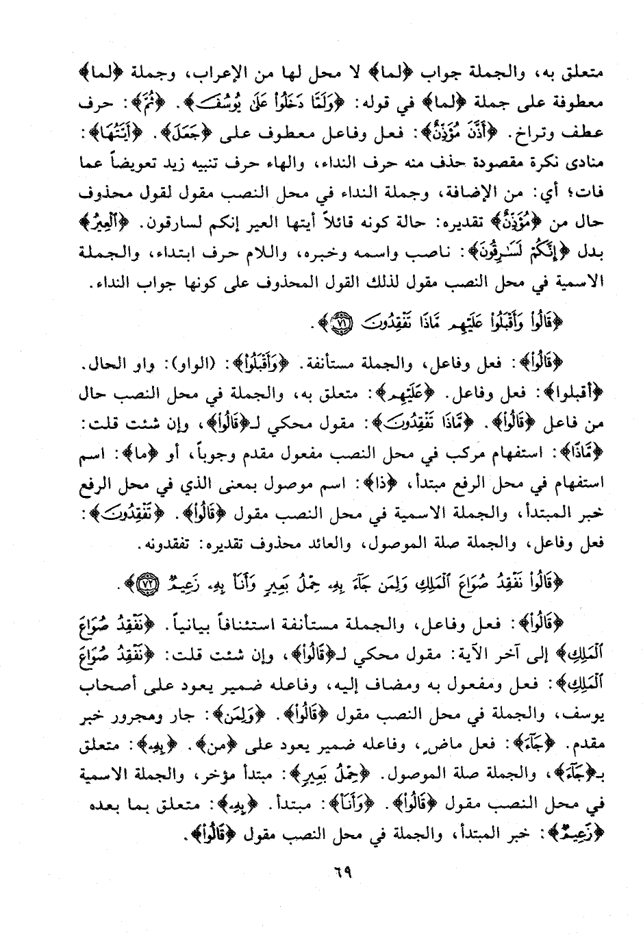 {قَالُوا}: فعل وفاعل، والجملة مستأنفة استئنافًا بيانيًّا. {نَفْقِدُ صُوَاعَ الْمَلِكِ} إلى آخر الآية: مقول محكي لـ {قَالُوا}، وإن شئت قلت: {نَفْقِدُ صُوَاعَ الْمَلِكِ}: فعل ومفعول به ومضاف إليه، وفاعله ضمير يعود على أصحاب يوسف، والجملة في محل النصب مقول {قَالُوا}. {وَلِمَنْ}: جار ومجرور خبر مقدم. {جَاءَ}: فعل ماضٍ، وفاعله ضمير يعود على {من}. {بِهِ}: متعلق بـ {جَاءَ}، والجملة صلة الموصول. {حِمْلُ بَعِيرٍ}: مبتدأ مؤخر، والجملة الاسمية في محل النصب مقول {قَالُوا}. {وَأَنَا} مبتدأ. {بِهِ}: متعلق بما بعده {زَعِيمٌ}: خبر المبتدأ، والجملة في محل النصب مقول {قَالُوا}.