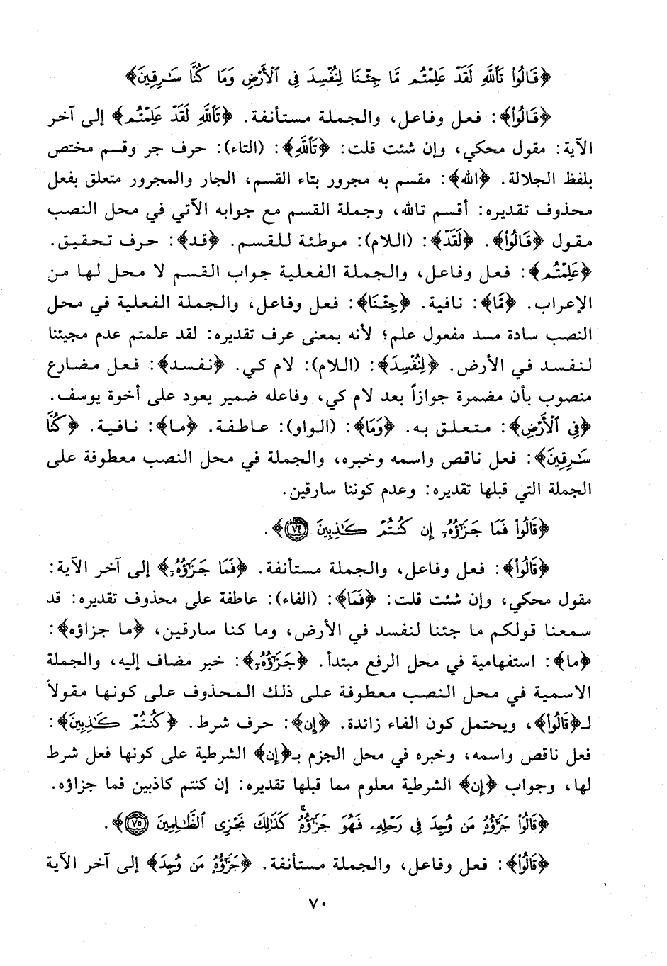 {قَالُوا}: فعل وفاعل، والجملة مستأنفة. {تَاللَّهِ لَقَدْ عَلِمْتُمْ} إلى آخر الآية: مقول محكي، وإن شئت قلت: {تَاللَّهِ}: (التاء): حرف جر وقسم مختص بلفظ الجلالة. {الله}: مقسم به مجرور بتاء القسم، الجار والمجرور متعلق بفعل محذوف تقديره: أقسم تالله، وجملة القسم مع جوابه الآتي في محل النصب مقول {قَالُوا}. {لَقَد}: {اللام}: موطئة للقسم. {قد}: حرف تحقيق. {عَلِمْتُمْ}: فعل وفاعل، والجملة الفعلية جواب القسم لا محل لها من الإعراب. {مَا}: نافية. {جِئْنَا}: فعل وفاعل، والجملة الفعلية في محل النصب سادة مسد مفعول علم؛ لأنه بمعنى عرف تقديره: لقد علمتم عدم مجيئنا لنفسد في الأرض. {لِنُفْسِد}: {اللام}: لام كي. {نفسد}: فعل مضارع منصوب بأن مضمرة جوازًا بعد لام كي، وفاعله ضمير يعود على أخوة يوسف. {فِي الْأَرْضِ}: متعلق به. {وَمَا}: (الواو): عاطفة. {ما}: نافية. {كُنَّا سَارِقِينَ}: فعل ناقص واسمه وخبره، والجملة في محل النصب معطوفة على الجملة التي قبلها تقديره: وعدم كوننا سارقين.