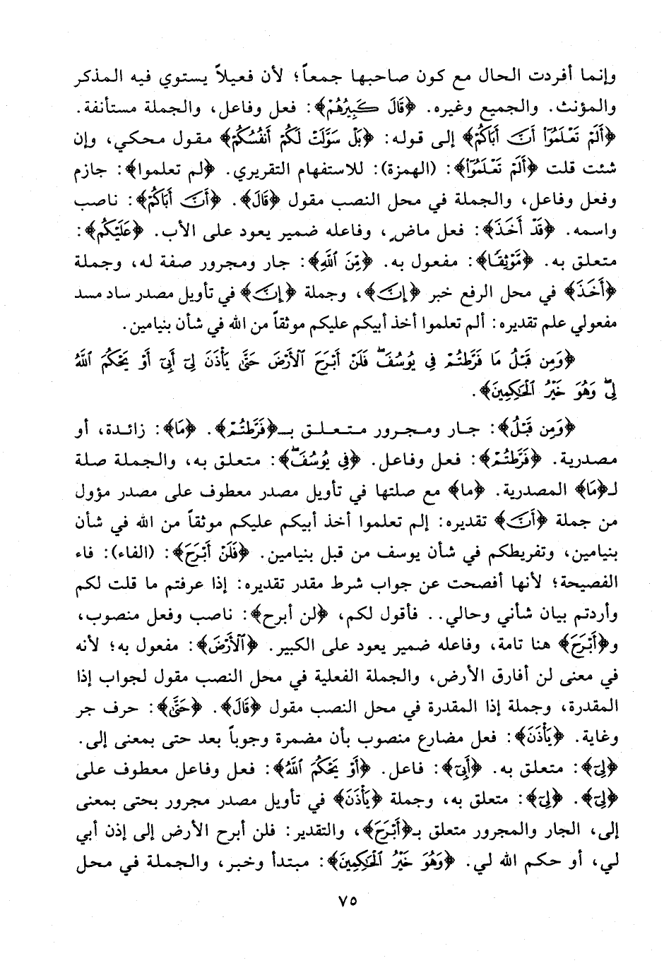 وإنما أفردت الحال مع كون صاحبها جمعًا؛ لأن فعيلًا يستوي فيه المذكر والمؤنث. والجميع وغيره. {قَالَ كَبِيرُهُمْ}: فعل وفاعل، والجملة مستأنفة. {أَلَمْ تَعْلَمُوا أَنَّ أَبَاكُمْ} إلى قوله: {بَلْ سَوَّلَتْ لَكُمْ أَنْفُسُكُمْ} مقول محكي، وإن شئت قلت {أَلَمْ تَعْلَمُوا}: (الهمزة): للاستفهام التقريري. {لَمْ تَعْلَمُوا}: جازم وفعل وفاعل، والجملة في محل النصب مقول {قَالَ}. {أَنَّ أَبَاكُمْ}: ناصب واسمه. {قَدْ أَخَذَ}: فعل ماضٍ، وفاعله ضمير يعود على الأب. {عَلَيْكُمْ}: متعلق به. {مَوْثِقًا}: مفعول به. {مِنَ اللَّهِ}: جار ومجرور صفة له، وجملة {أَخَذَ} في محل الرفع خبر {أَنَّ}، وجملة {أَنَّ} في تأويل مصدر ساد مسد مفعولي علم تقديره: ألم تعلموا أخذ أبيكم عليكم موثقًا من الله في شأن بنيامين.