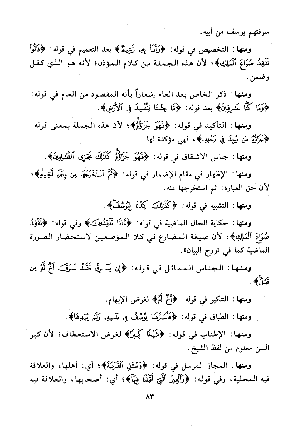 ومنها: جناس الاشتقاق في قوله: {فَهُوَ جَزَاؤُهُ كَذَلِكَ نَجْزِي الظَّالِمِينَ}. ومنها: الإظهار في مقام الإضمار في قوله: {ثُمَّ اسْتَخْرَجَهَا مِنْ وِعَاءِ أَخِيهِ}؛ لأن حق العبارة: ثم استخرجها منه.