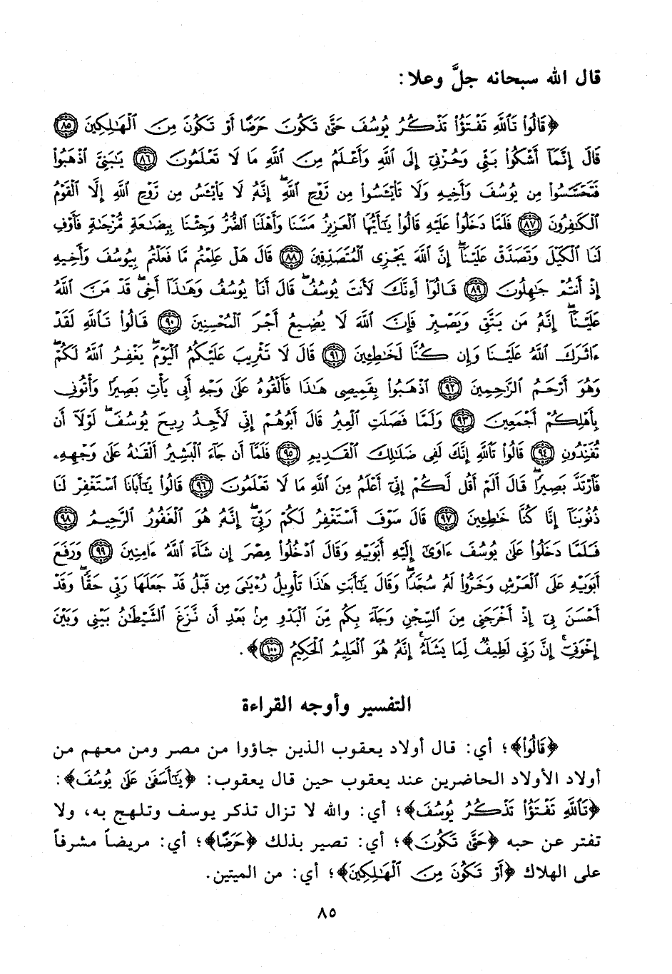 {قَالُوا تَاللَّهِ تَفْتَأُ تَذْكُرُ يُوسُفَ حَتَّى تَكُونَ حَرَضًا أَوْ تَكُونَ مِنَ الْهَالِكِينَ (85) قَالَ إِنَّمَا أَشْكُو بَثِّي وَحُزْنِي إِلَى اللَّهِ وَأَعْلَمُ مِنَ اللَّهِ مَا لَا تَعْلَمُونَ (86) يَا بَنِيَّ اذْهَبُوا فَتَحَسَّسُوا مِنْ يُوسُفَ وَأَخِيهِ وَلَا تَيْأَسُوا مِنْ رَوْحِ اللَّهِ إِنَّهُ لَا يَيْأَسُ مِنْ رَوْحِ اللَّهِ إِلَّا الْقَوْمُ الْكَافِرُونَ (87) فَلَمَّا دَخَلُوا عَلَيْهِ قَالُوا يَا أَيُّهَا الْعَزِيزُ مَسَّنَا وَأَهْلَنَا الضُّرُّ وَجِئْنَا بِبِضَاعَةٍ مُزْجَاةٍ فَأَوْفِ لَنَا الْكَيْلَ وَتَصَدَّقْ عَلَيْنَا إِنَّ اللَّهَ يَجْزِي الْمُتَصَدِّقِينَ (88) قَالَ هَلْ عَلِمْتُمْ مَا فَعَلْتُمْ بِيُوسُفَ وَأَخِيهِ إِذْ أَنْتُمْ جَاهِلُونَ (89) قَالُوا أَإِنَّكَ لَأَنْتَ يُوسُفُ قَالَ أَنَا يُوسُفُ وَهَذَا أَخِي قَدْ مَنَّ اللَّهُ عَلَيْنَا إِنَّهُ مَنْ يَتَّقِ وَيَصْبِرْ فَإِنَّ اللَّهَ لَا يُضِيعُ أَجْرَ الْمُحْسِنِينَ (90) قَالُوا تَاللَّهِ لَقَدْ آثَرَكَ اللَّهُ عَلَيْنَا وَإِنْ كُنَّا لَخَاطِئِينَ (91) قَالَ لَا تَثْرِيبَ عَلَيْكُمُ الْيَوْمَ يَغْفِرُ اللَّهُ لَكُمْ وَهُوَ أَرْحَمُ الرَّاحِمِينَ (92) اذْهَبُوا بِقَمِيصِي هَذَا فَأَلْقُوهُ عَلَى وَجْهِ أَبِي يَأْتِ بَصِيرًا وَأْتُونِي بِأَهْلِكُمْ أَجْمَعِينَ (93) وَلَمَّا فَصَلَتِ الْعِيرُ قَالَ أَبُوهُمْ إِنِّي لَأَجِدُ رِيحَ يُوسُفَ لَوْلَا أَنْ تُفَنِّدُونِ (94) قَالُوا تَاللَّهِ إِنَّكَ لَفِي ضَلَالِكَ الْقَدِيمِ (95) فَلَمَّا أَنْ جَاءَ الْبَشِيرُ أَلْقَاهُ عَلَى وَجْهِهِ فَارْتَدَّ بَصِيرًا قَالَ أَلَمْ أَقُلْ لَكُمْ إِنِّي أَعْلَمُ مِنَ اللَّهِ مَا لَا تَعْلَمُونَ (96) قَالُوا يَا أَبَانَا اسْتَغْفِرْ لَنَا ذُنُوبَنَا إِنَّا كُنَّا خَاطِئِينَ (97) قَالَ سَوْفَ أَسْتَغْفِرُ لَكُمْ رَبِّي إِنَّهُ هُوَ الْغَفُورُ الرَّحِيمُ (98) فَلَمَّا دَخَلُوا عَلَى يُوسُفَ آوَى إِلَيْهِ أَبَوَيْهِ وَقَالَ ادْخُلُوا مِصْرَ إِنْ شَاءَ اللَّهُ آمِنِينَ (99) وَرَفَعَ أَبَوَيْهِ عَلَى الْعَرْشِ وَخَرُّوا لَهُ سُجَّدًا وَقَالَ يَا أَبَتِ هَذَا تَأْوِيلُ رُؤْيَايَ مِنْ قَبْلُ قَدْ جَعَلَهَا رَبِّي حَقًّا وَقَدْ أَحْسَنَ بِي إِذْ أَخْرَجَنِي مِنَ السِّجْنِ وَجَاءَ بِكُمْ مِنَ الْبَدْوِ مِنْ بَعْدِ أَنْ نَزَغَ الشَّيْطَانُ بَيْنِي وَبَيْنَ إِخْوَتِي إِنَّ رَبِّي لَطِيفٌ لِمَا يَشَاءُ إِنَّهُ هُوَ الْعَلِيمُ الْحَكِيمُ (100)}.