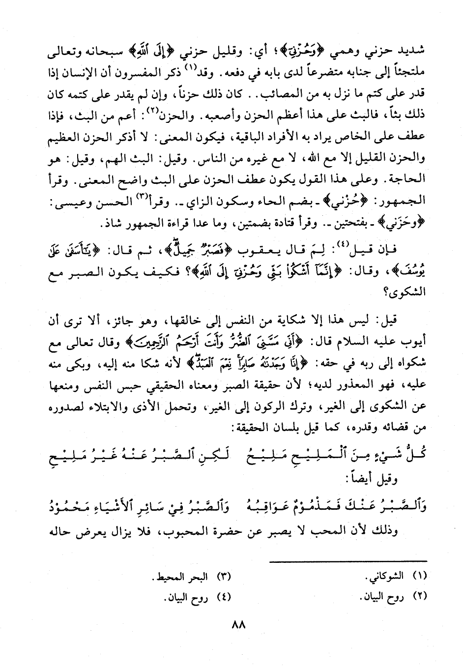 شديد حزني وهمي {وَحُزْنِي}؛ أي: وقليل حزني {إِلَى اللَّهِ} سبحانه وتعالى ملتجئًا إلى جنابه متضرعًا لدى بابه في دفعه. وقد (¬1) ذكر المفسرون أن الإنسان إذا قدر على كتم ما نزل به من المصائب .. كان ذلك حزنًا، وإن لم يقدر على كتمه كان ذلك بثًا، فالبث على هذا أعظم الحزن وأصعبه. والحزن (¬2): أعم من البث، فإذا عطف على الخاص يراد به الأفراد الباقية، فيكون المعنى: لا أذكر الحزن العظيم والحزن القليل إلا مع الله، لا مع غيره من الناس. وقيل: البث الهم، وقيل: هو الحاجة. وعلى هذا القول يكون عطف الحزن على البث واضح المعنى. وقرأ الجمهور: {حُزْني} - بضم الحاء وسكون الزاي -. وقرأ (¬3) الحسن وعيسى: {وحَزَني} - بفتحتين -. وقرأ قتادة بضمتين، وما عدا قراءة الجمهور شاذ.