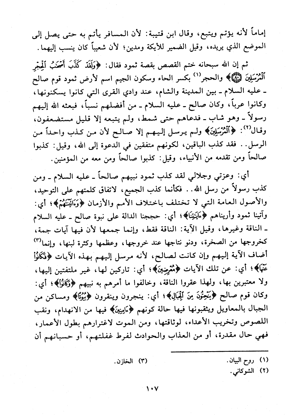 80 - ثم إن الله سبحانه ختم القصص بقصة ثمود فقال: {وَلَقَدْ كَذَّبَ أَصْحَابُ الْحِجْرِ الْمُرْسَلِينَ (80)} والحجر (¬1) بكسر الحاء وسكون الجيم اسم لأرض ثمود قوم صالح - عليه السلام - بين المدينة والشام، عند وادي القرى التي كانوا يسكنونها، وكانوا عربًا، وكان صالح - عليه السلام - من أفضلهم نسبًا، فبعثه الله إليهم رسولًا - وهو شاب - فدعاهم حتى شمط، ولم يتبعه إلا قليل مستضعفون، وقال (¬2): {الْمُرْسَلِينَ} ولم يرسل إليهم إلا صالح لأن من كذب واحدًا من الرسل .. فقد كذب الباقين، لكونهم متفقين في الدعوة إلى الله، وقيل: كذبوا صالحًا ومن تقدمه من الأنبياء، وقيل: كذبوا صالحًا ومن معه من المؤمنين.